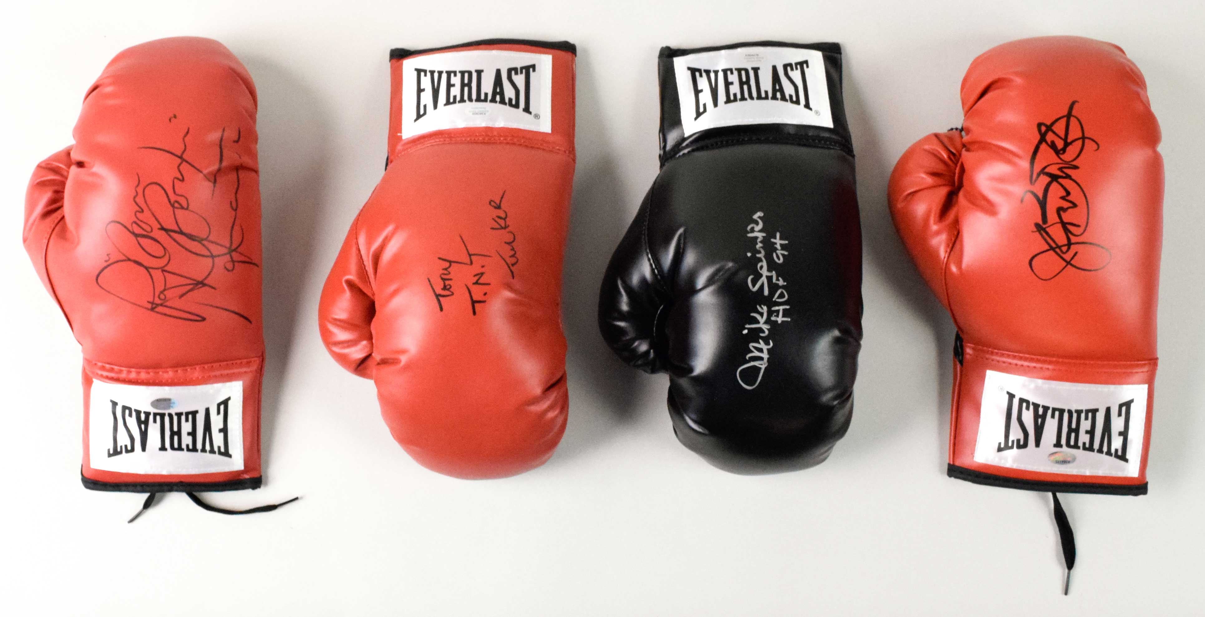 Description:Boom Boom Mancini, Michael Spinks, Buster Douglas, Tony Tucker signed boxing gloves (NM-NM/MT). Includes a red Everlast glove signed by Ray "Boom Boom" Mancini, black Everlast glove signed by Mike Spinks with "HOF 94" inscription, red Everlast glove signed by Tony "T.N.T." Tucker, and red Everlast glove signed by James "Buster" Douglas. Signatures rate 8 to 9/10 out of 10. Schwartz Sports serial #ed hologram sticker is on each glove: NM-NM/MT
