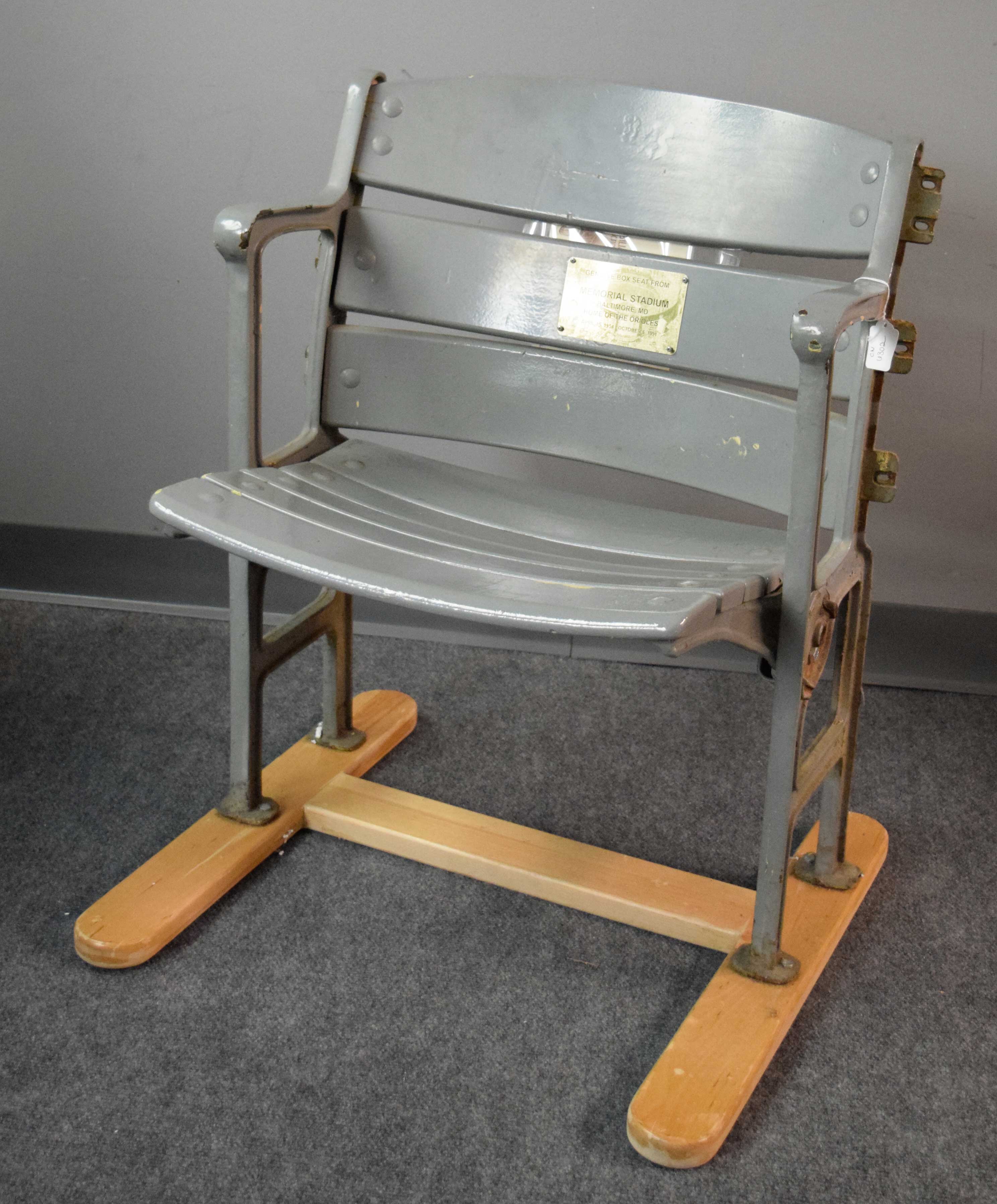 Description:Baltimore Memorial Stadium seat (EX). Box seat #3 from unknown section within Memorial Stadium. Attached placard notes the stadium's use by the Baltimore Orioles from 1954-1991. Appears to have been touched-up with gray paint at a few areas, but not entirely. Includes COA from the Maryland Stadium Authority: EX