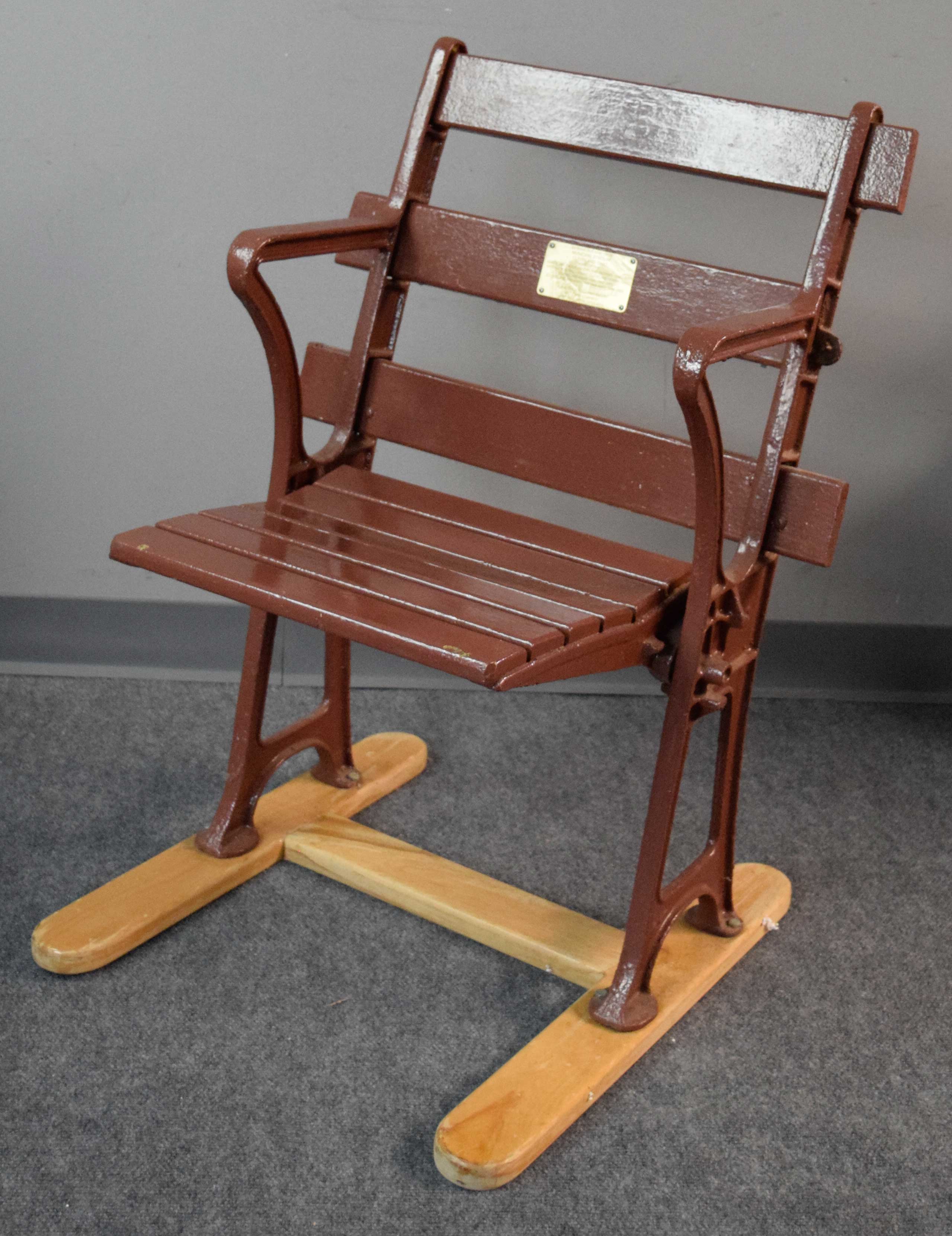 Description:Cleveland Municipal Stadium seat (EX repainted). Box seat from unknown section of the stadium with attached placard noting the years the stadium was used by the Cleveland Indians, Rams, and Browns. Repainted: EX