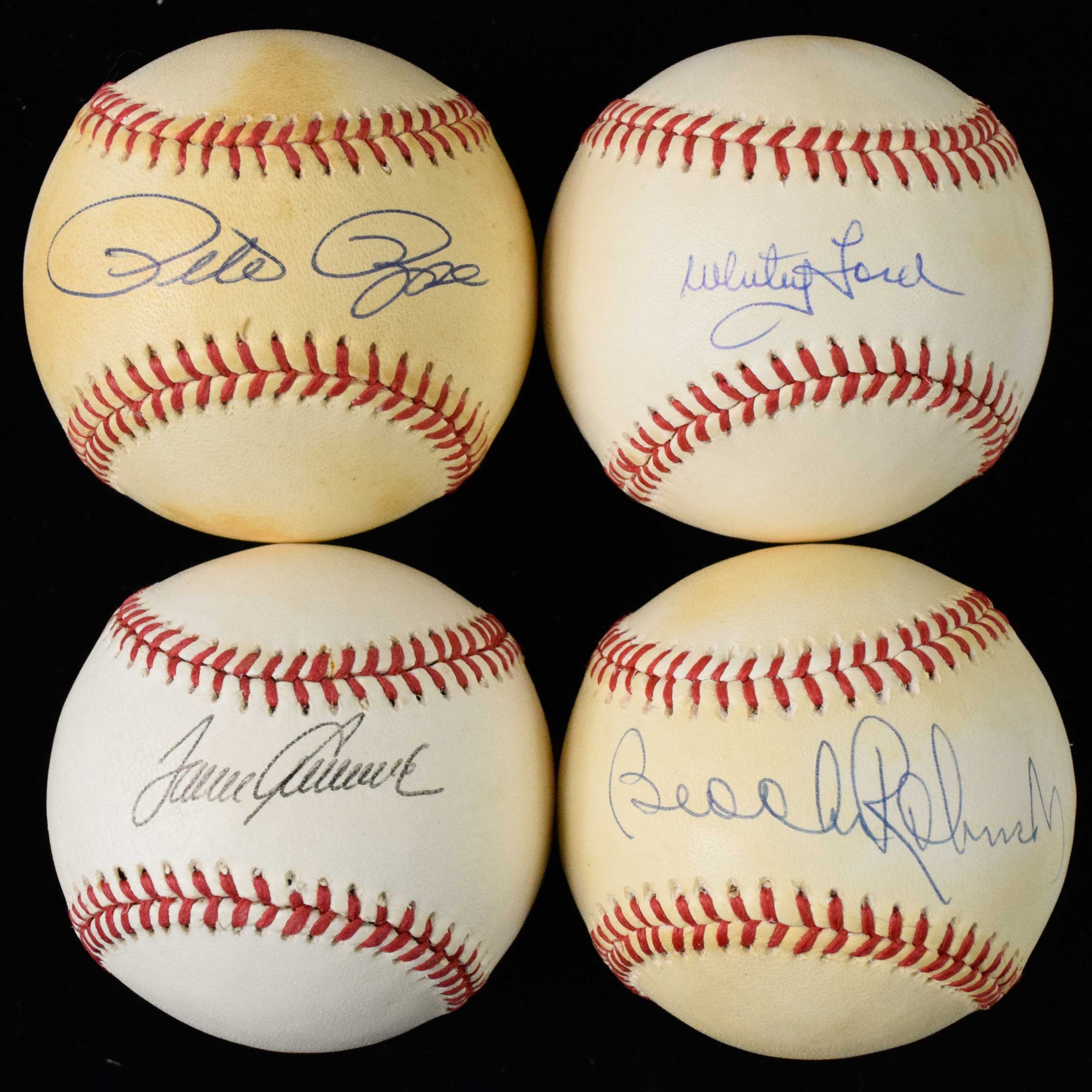 Description:Lot of (5) stars and HOFers signed baseballs (VG-EX/MT). Includes L.Coleman NL ball (toned) signed by Richie Ashburn with "HOF 95" inscription, Rawlings Official League ball signed by Tom Seaver, B.Brown AL ball (light toning) signed by Whitey Ford, B.Brown AL ball (toning) signed by Brooks Robinson, and W.White NL ball (toned) signed by Pete Rose. Signatures rate 8 to 9/10 out of 10: VG-EX/MT