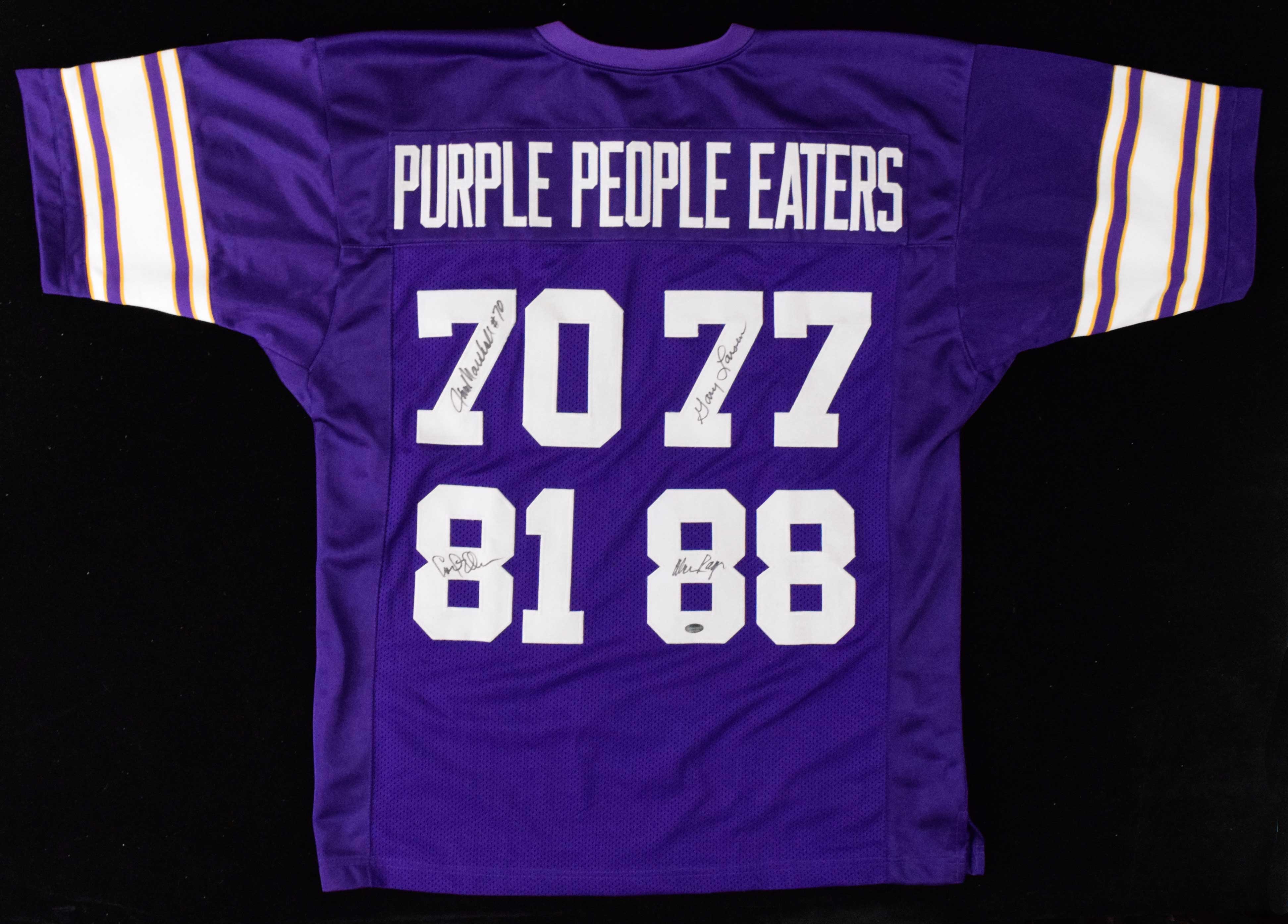 Description:Purple People Eaters multi-signed Minnesota Vikings style jersey (NM). Size XL jersey signed by Alan Page, Carl Eller, Jim Marshall, and Gary Larsen in black marker. Signatures rate 8 to 9/10 out of 10. Schwartz Sports serial #ed hologram sticker is on the jersey. No maker tagging: NM