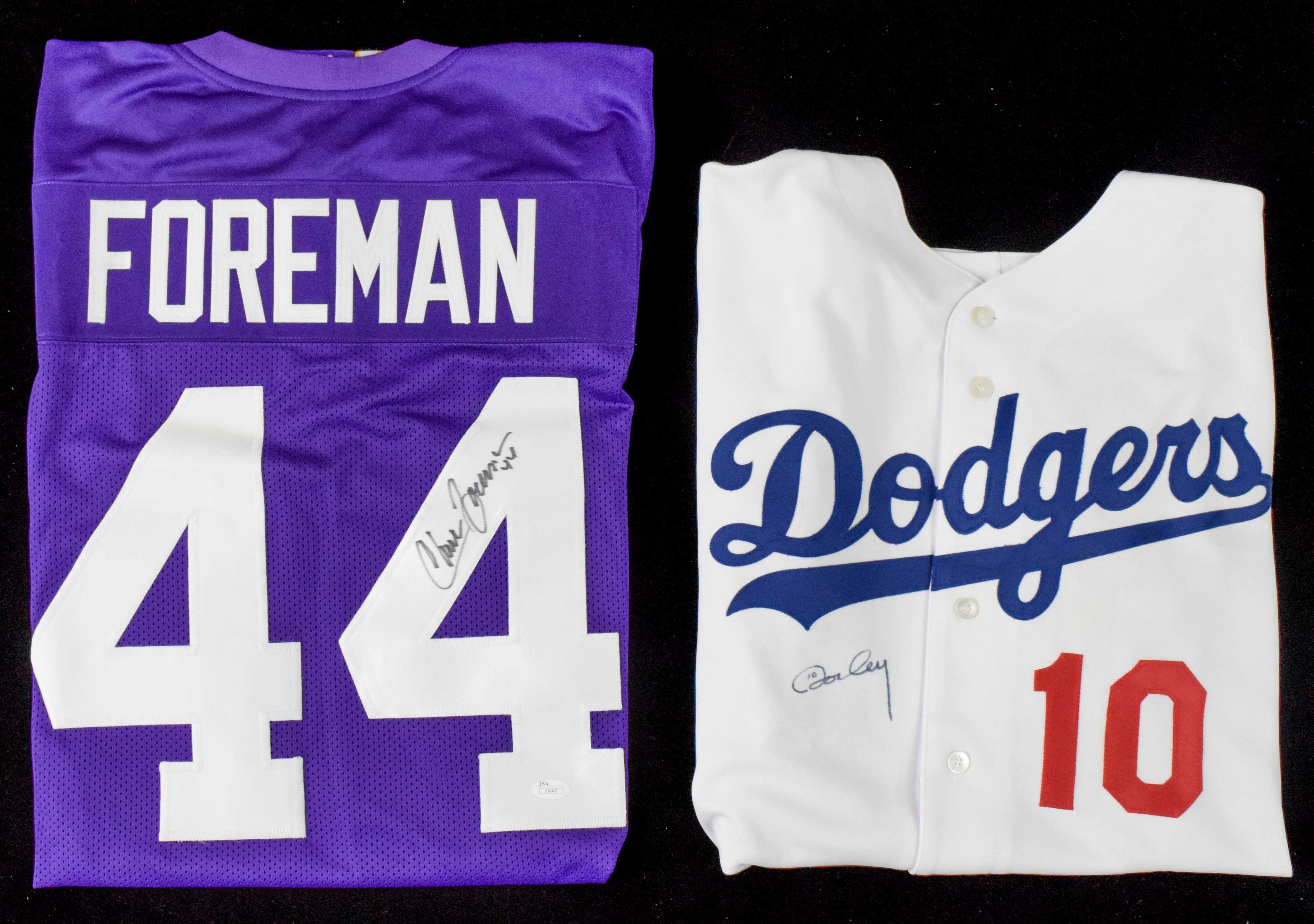 Description:Chuck Foreman, Ron Cey, and Chris Johnson signed jerseys (NM-NM/MT). Includes a Majestic size 44 Los Angeles Dodgers #10 Ron Cey jersey signed by Cey in black marker, size L #44 Chuck Foreman jersey signed by Foreman in black marker (JSA), and Majestic size 40 Atlanta Braves #23 Chris Johnson jersey signed by Johnson in black marker (MLB Authenticated). Signatures rate 7/8 to 8/9 out of 10: NM-NM/MT