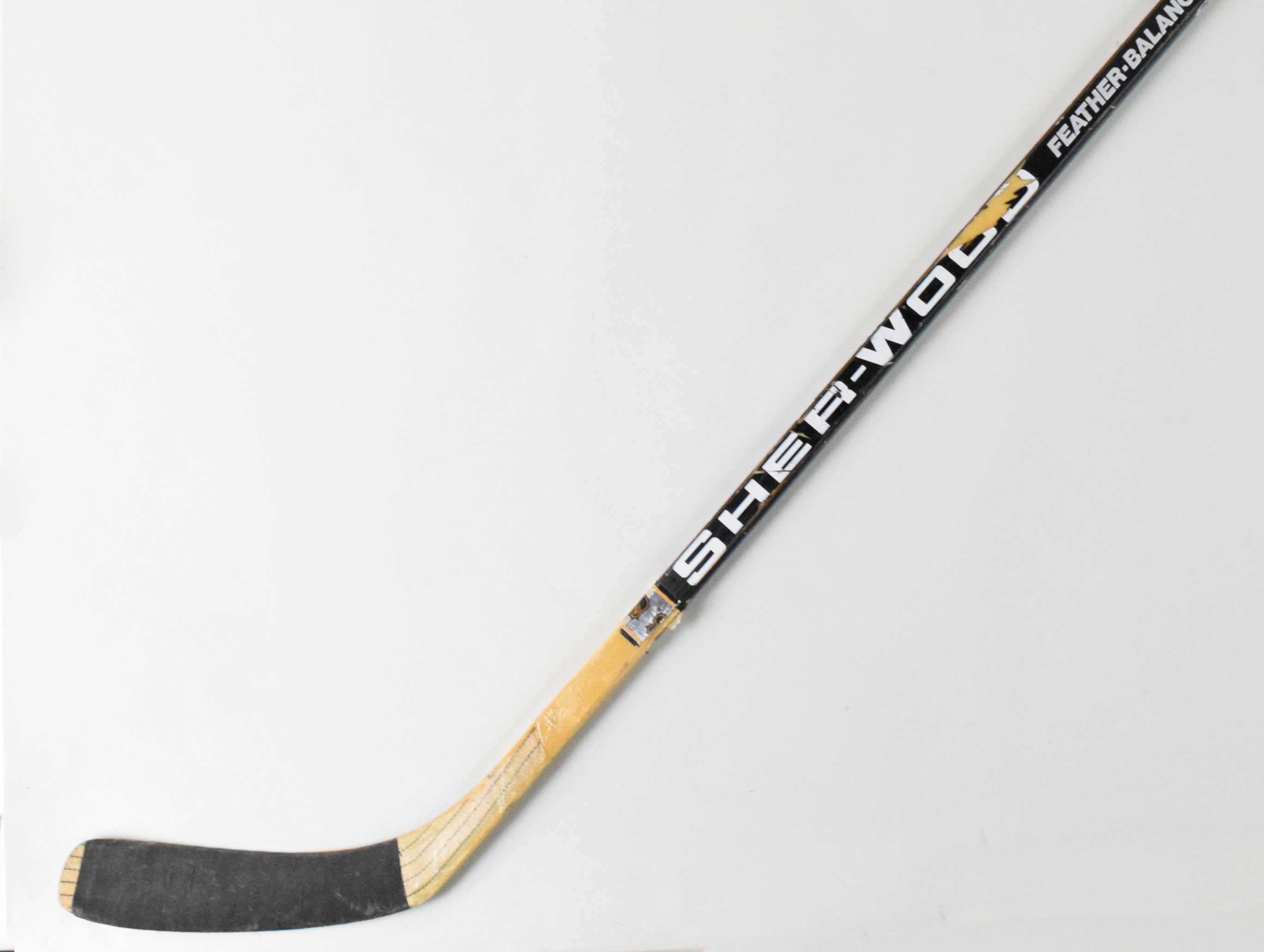 Description:Chris Chelios professional model hockey stick, c.1990s (EX). Sher-Wood S.O.P. 7000 Feather-Balanced stick with "CHELIOS" stamped at the top of the handle, and "CHICAGO" stamped at the bottom of the handle near the blade. Nice use with tape on the end of the handle, taped blade, and spots of surface loss up and down the handle: EX