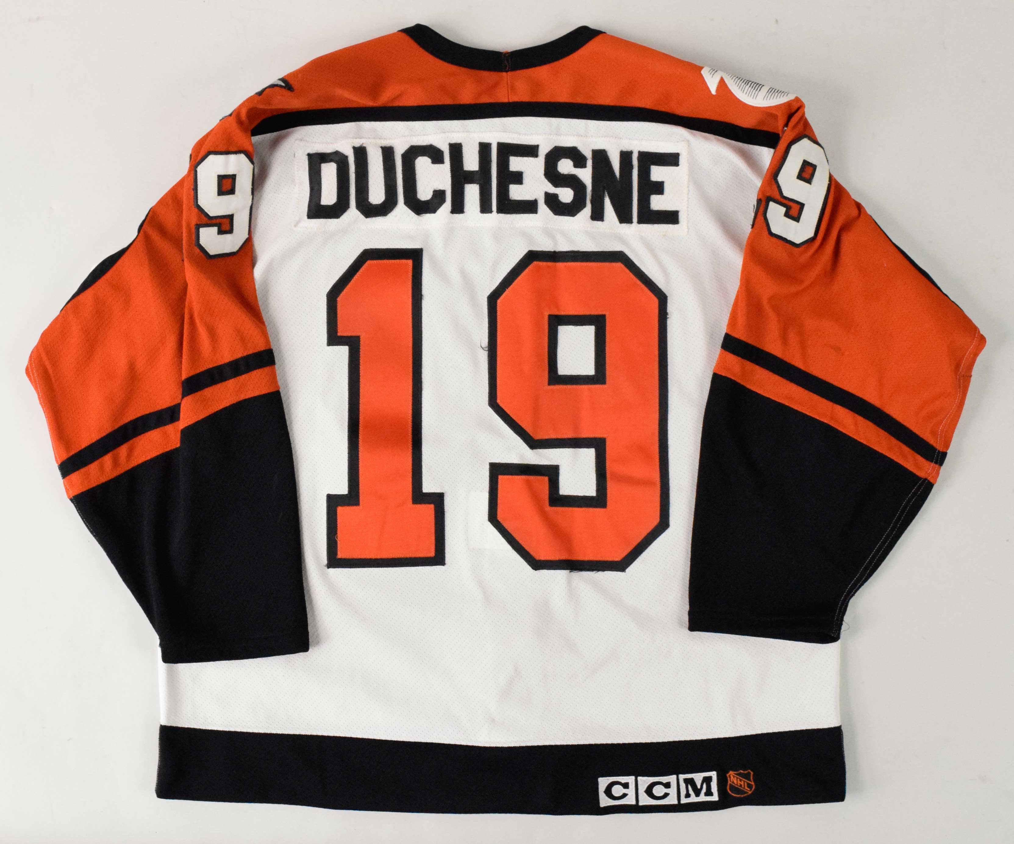 Description:1991-92 Steve Duchesne professional model Philadelphia Flyers jersey (EX). CCM jersey with Maska/Air-Knit tag in the collar, Flyers logo on the front, "DUCHESNE" nameplate on the back, #19 on the back and sleeves, NHL 75 patch on the right shoulder, and Flyers 25th Anniversary patch on the left shoulder. Shows impressive use with numerous stains and impact marks: EX