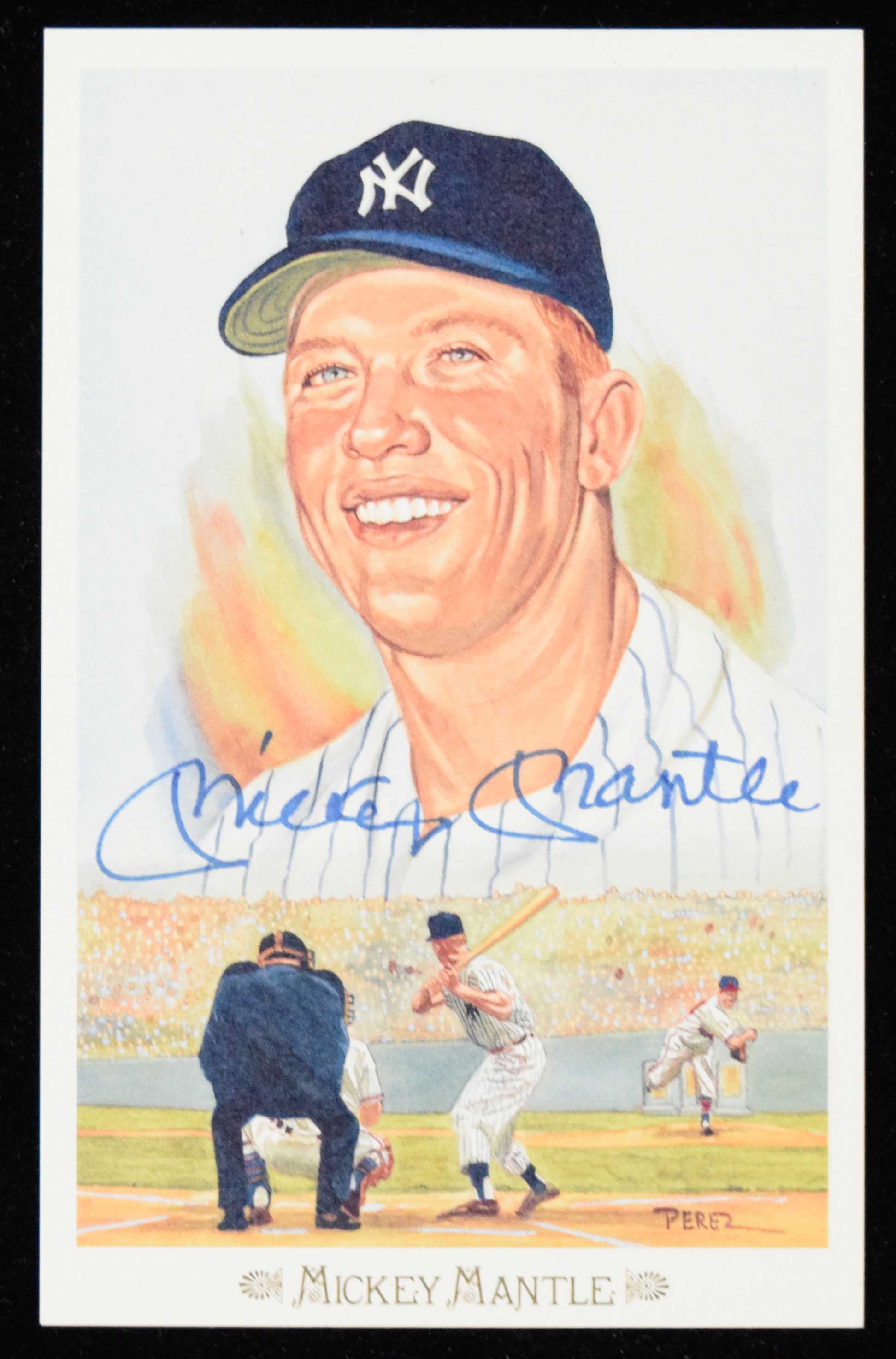 Description:Mickey Mantle signed 1989 Perez-Steele Celebration postcard - JSA (NM). Mantle signed the front in blue marker. Signature rates 9/10 out of 10. Includes LOA from JSA, with matching serial #ed sticker on the back of the postcard: NM