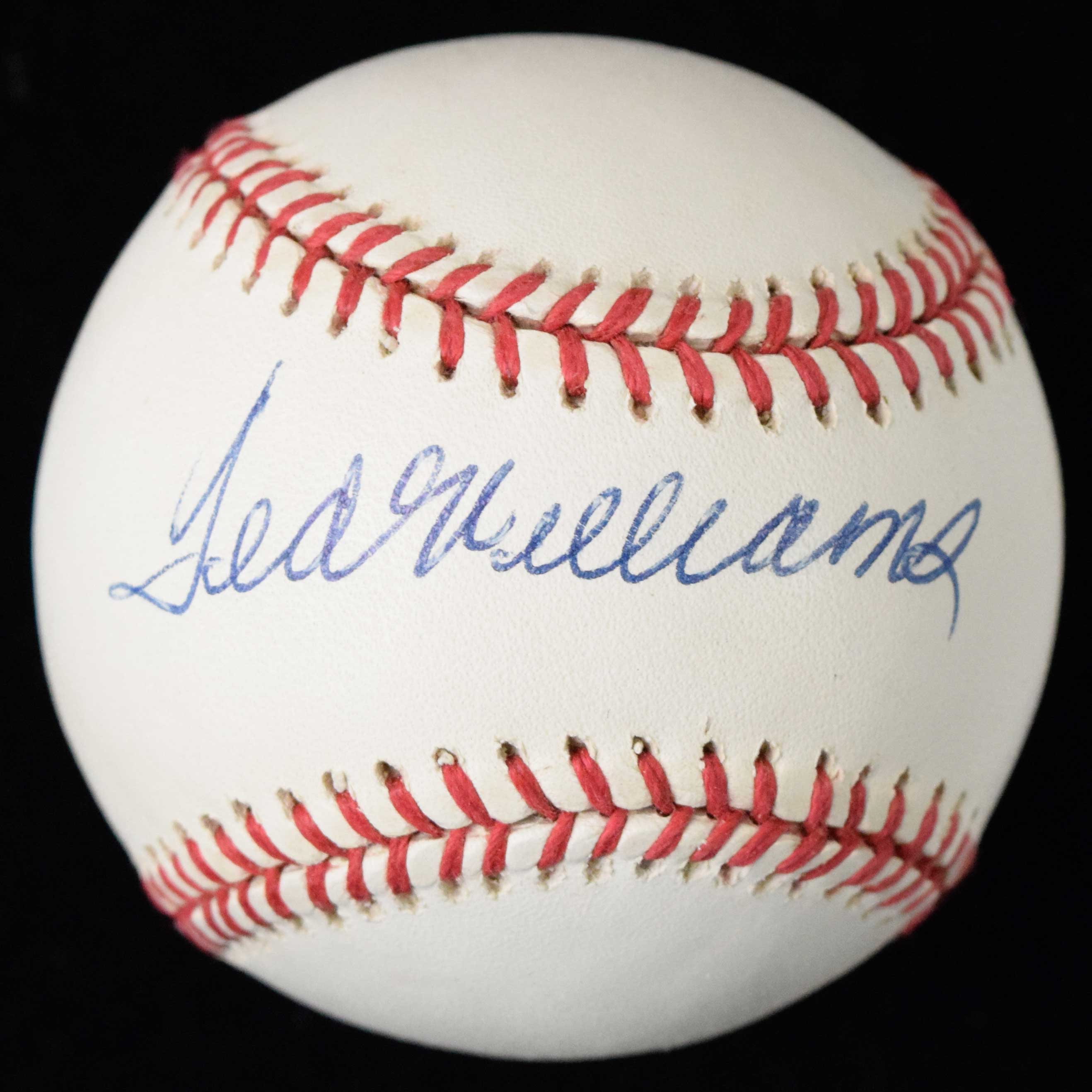 Description:Ted Williams signed B.Brown AL baseball - JSA (NM). Williams signed the sweet spot in blue ink. Signature rates 8/9 out of 10. Includes LOA from JSA, with matching serial #ed sticker on the ball: NM