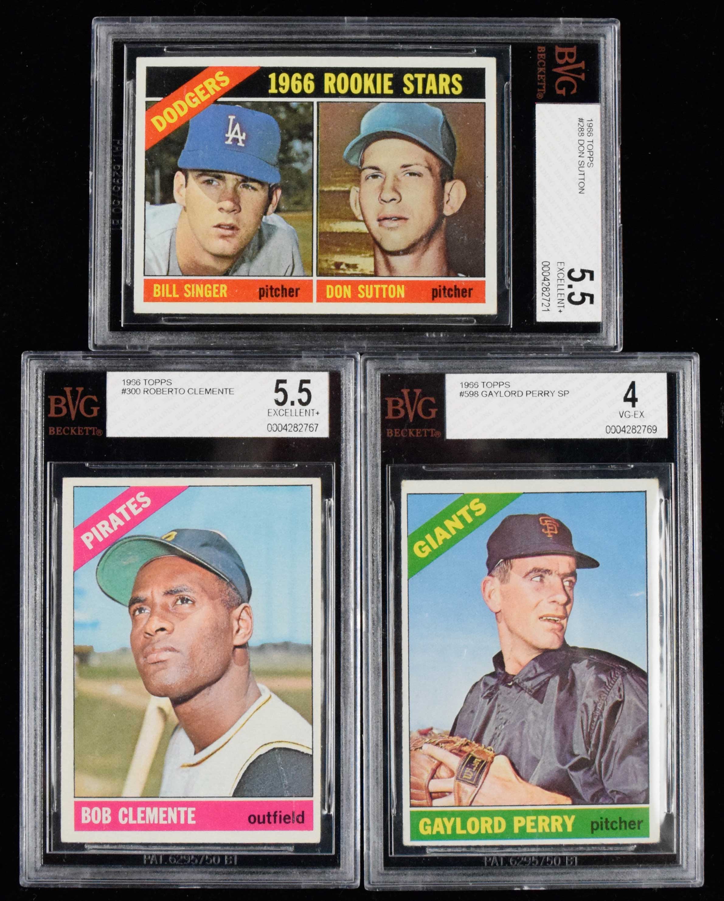 Don Sutton, Roberto Clemente, and Gaylord Perry graded 1966 Topps Baseball cards (VG/EX-EX+). Includes #s 288 Sutton rookie (Beckett 5.5 EX+), 300 Clemente (Beckett 5.5 EX+), and 598 Perry short print (Beckett 4 VG/EX).