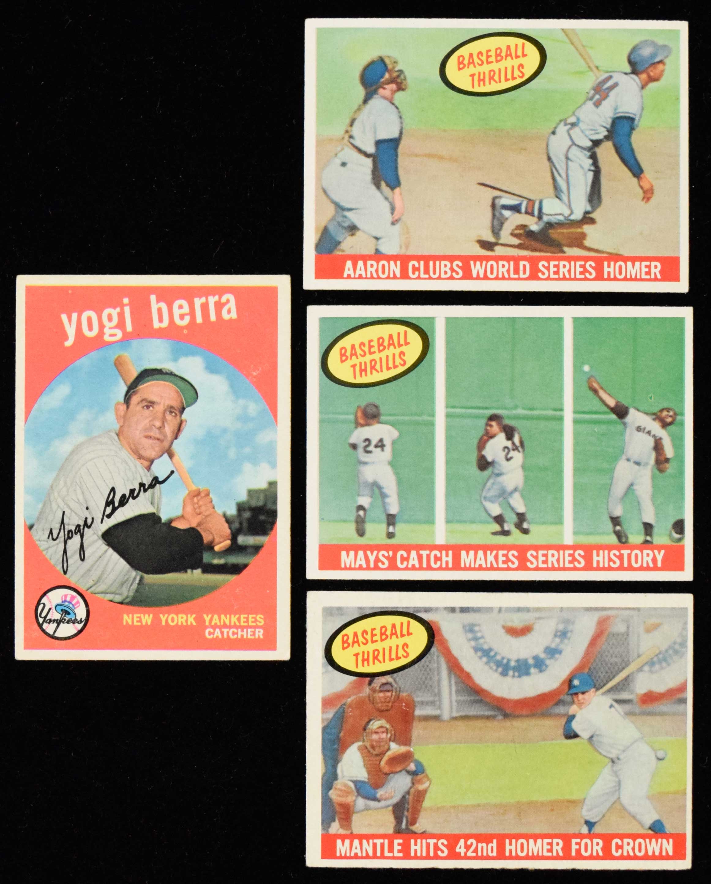 Lot of (146) 1959 Topps Baseball cards incl. HOFers and stars (GD-EX) Nice lot with VG-EX general condition condition however there are a handful lesser. Notables incl. #1 Frick, 30 Fox, 34 Pitchers Beware, 147 Cub Clubbers, 149 Bunning, 156 Ace Hurlers, 166 Destruction Crew, 180 Berra, 200 Giles, 260 Wynn, 270 Hodges (crease), 360 Kaline, 387 Drysdale, 390 Cepeda, 408 Keystone Combo, 415 Mazeroski, 439 Robinson, 455 Doby, 461 Mantle HR, 462 Colavito, 463 Kaline, 464 Mays, 467 Aaron, 468 Snider, 515 Killebrew (miscut), 552 Stengel), 555 Mazeroski, 556 Fox, and 557 Boyer: GD-EX