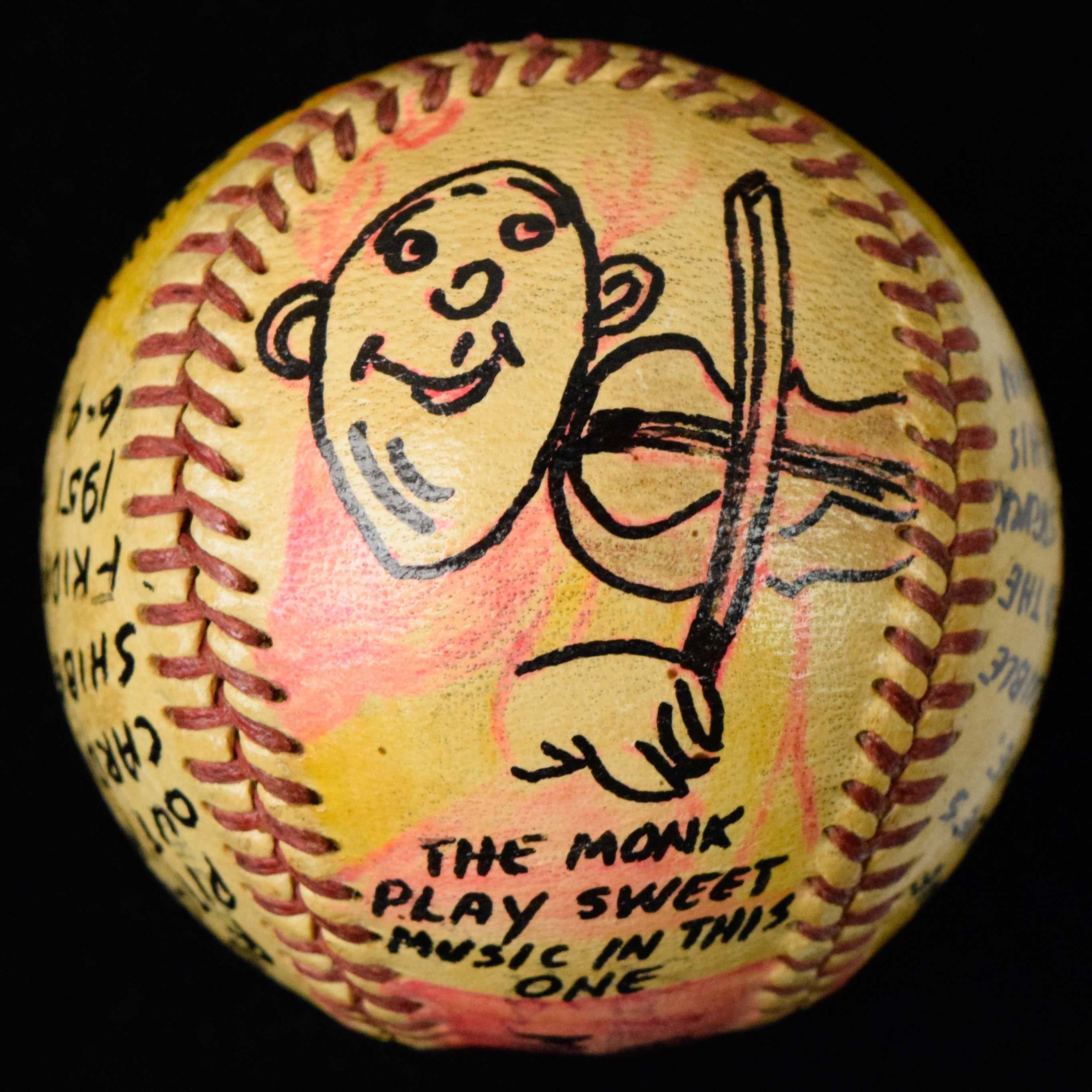 Description:5/4/1951 hand painted Russ Meyer season win #1 baseball (EX/MT). Colorfully painted along with text including "Russ Out Pitched And Out Hit Three Cardinals In Shibe Park On Friday May 4th 1951 For This 6-4 Win", along with the date and other game info: EX/MT