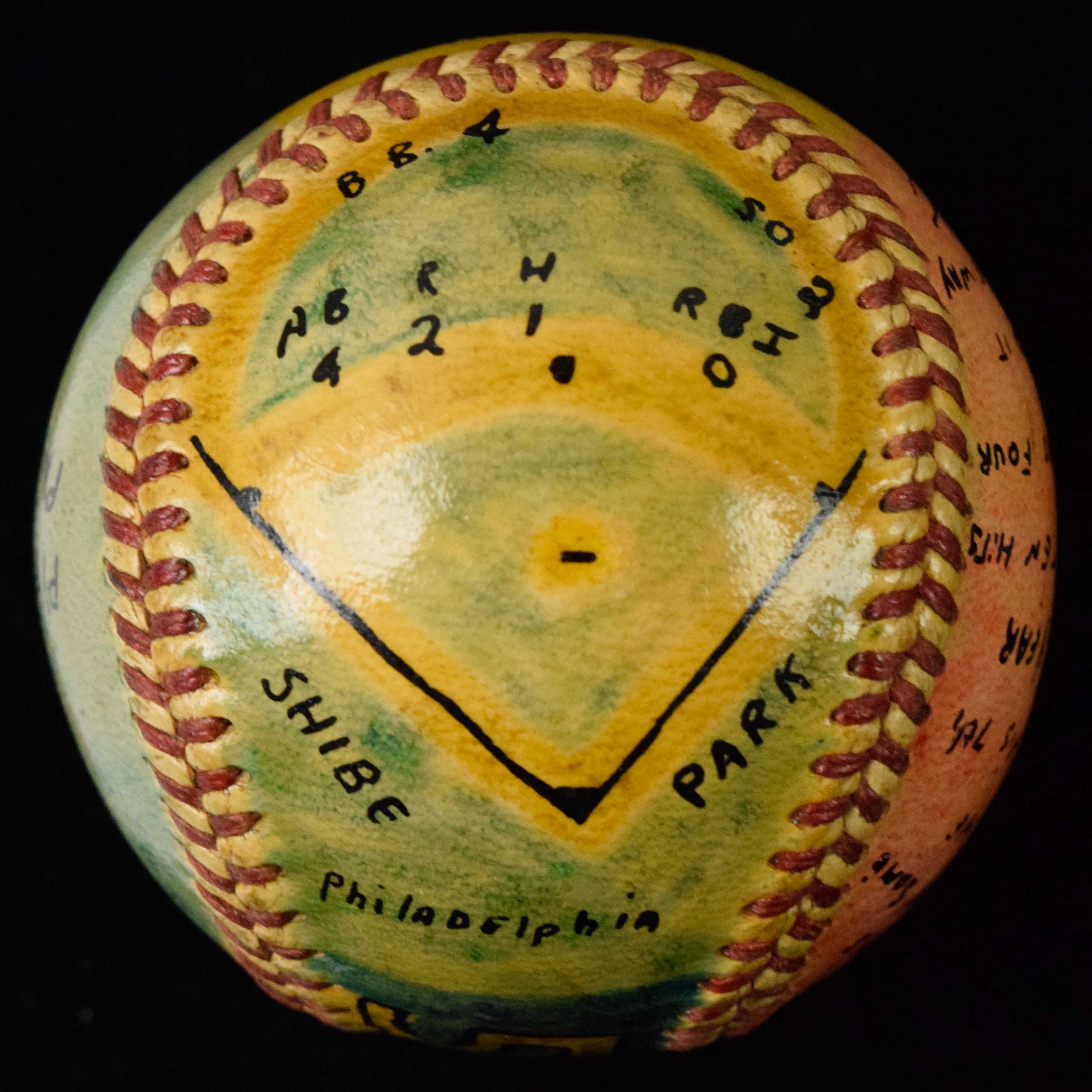 Description:7/22/1952 hand painted Russ Meyer season win #7 baseball (EX/MT). Colorfully painted along with text including "The Boys Get Monk Some Runs And He Breezes To His 7th Victory Of Year...", along with the date and other game info: EX/MT