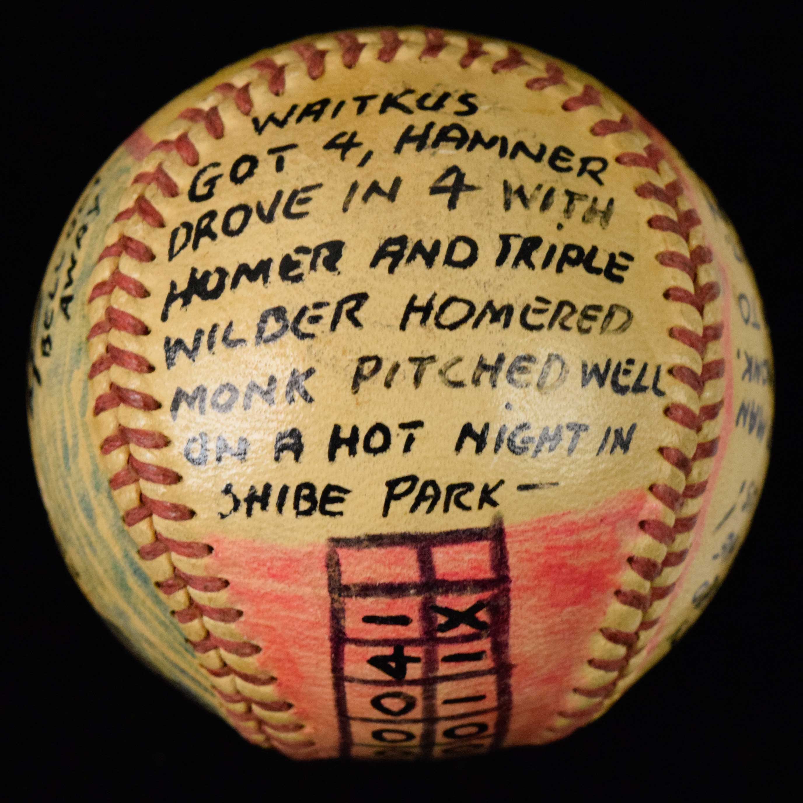 Description:7/12/1951 hand painted Russ Meyer season win #6 baseball (EX/MT). Colorfully painted along with text including "The Monk Sunk The Pirates For The 3rd Time" (next to a drawing of Ralph Kiner jumping off of a ship), along with the date and other game info: EX/MT