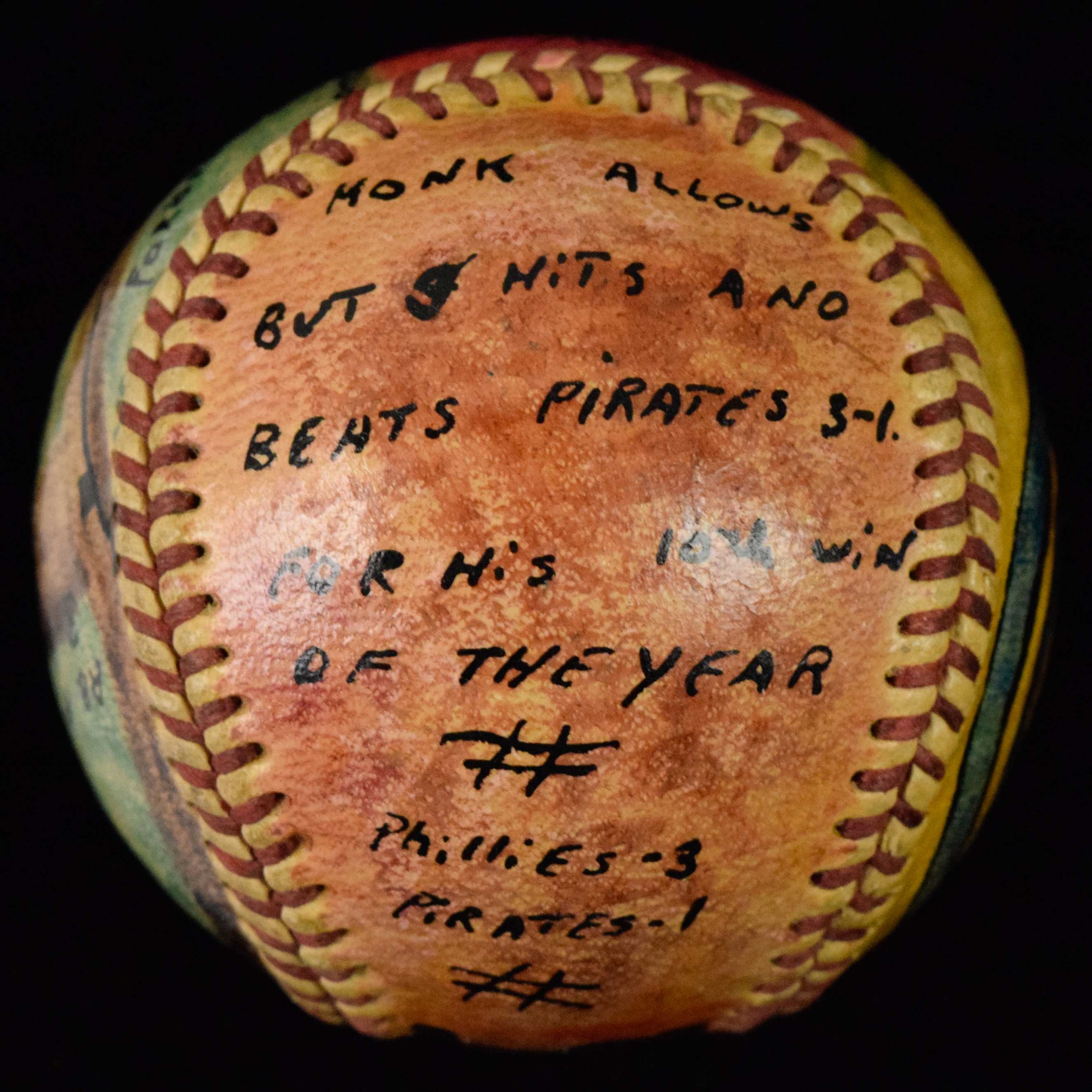 Description:8/20/1952 hand painted Russ Meyer season win #10 baseball (EX/MT). Colorfully painted along with text including "Russ Meyer Has Control Of The Situation All The Way. Struck Out One And Walked But One Man", along with the date and other game info: EX/MT