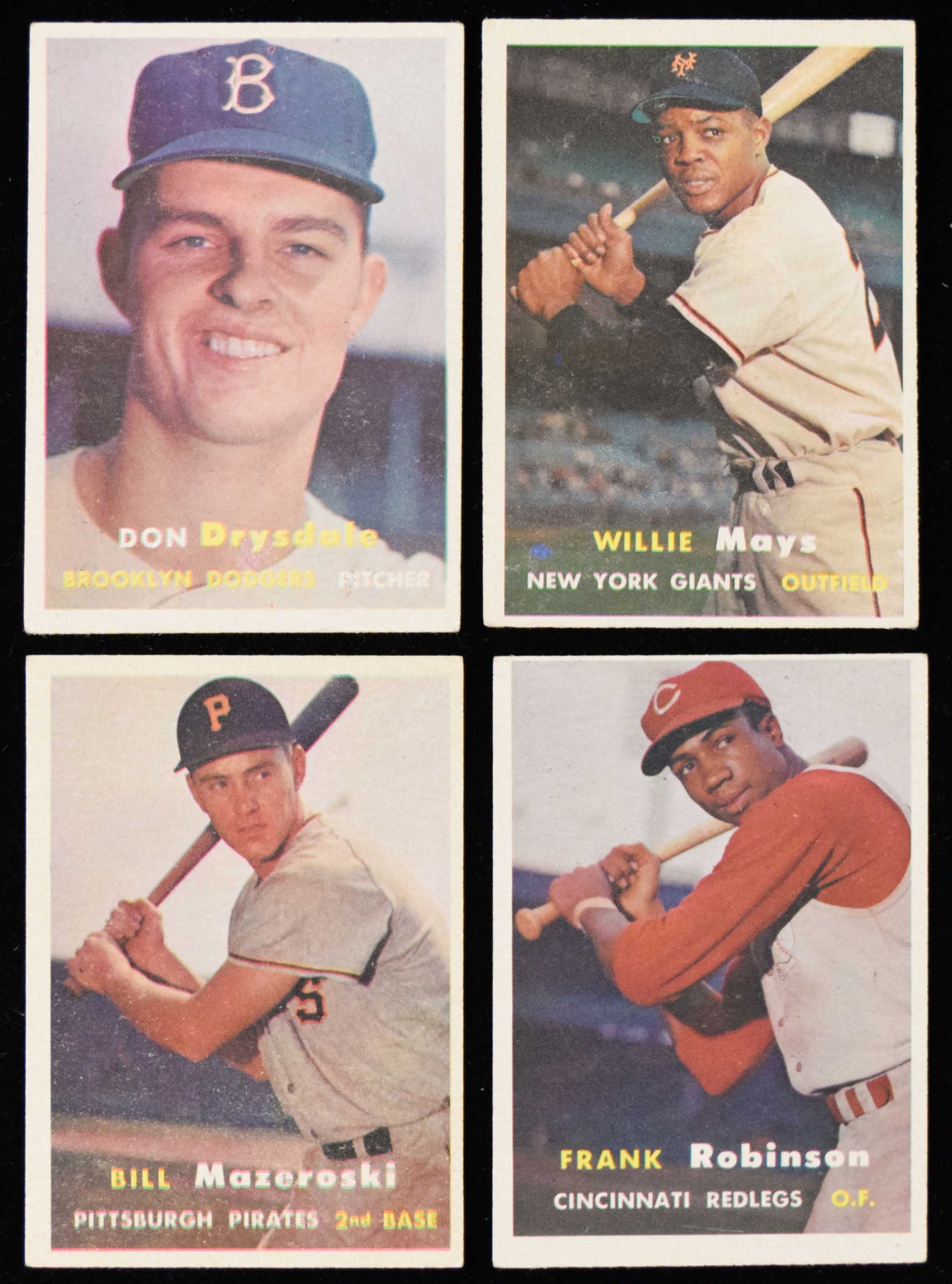 Description:Lot of (6) 1957 Topps Hall of Famers incl. Mays and (3) Rookies (VG/EX-EX) Includes #10 Mays (VG/EX-EX), 18 Drysdale (VG/EX), 24 Mazeroski (EX), 25 Ford (VG/EX OC), 30 Reese (EX), and 35 Robinson (EX OC): VG/EX-EX