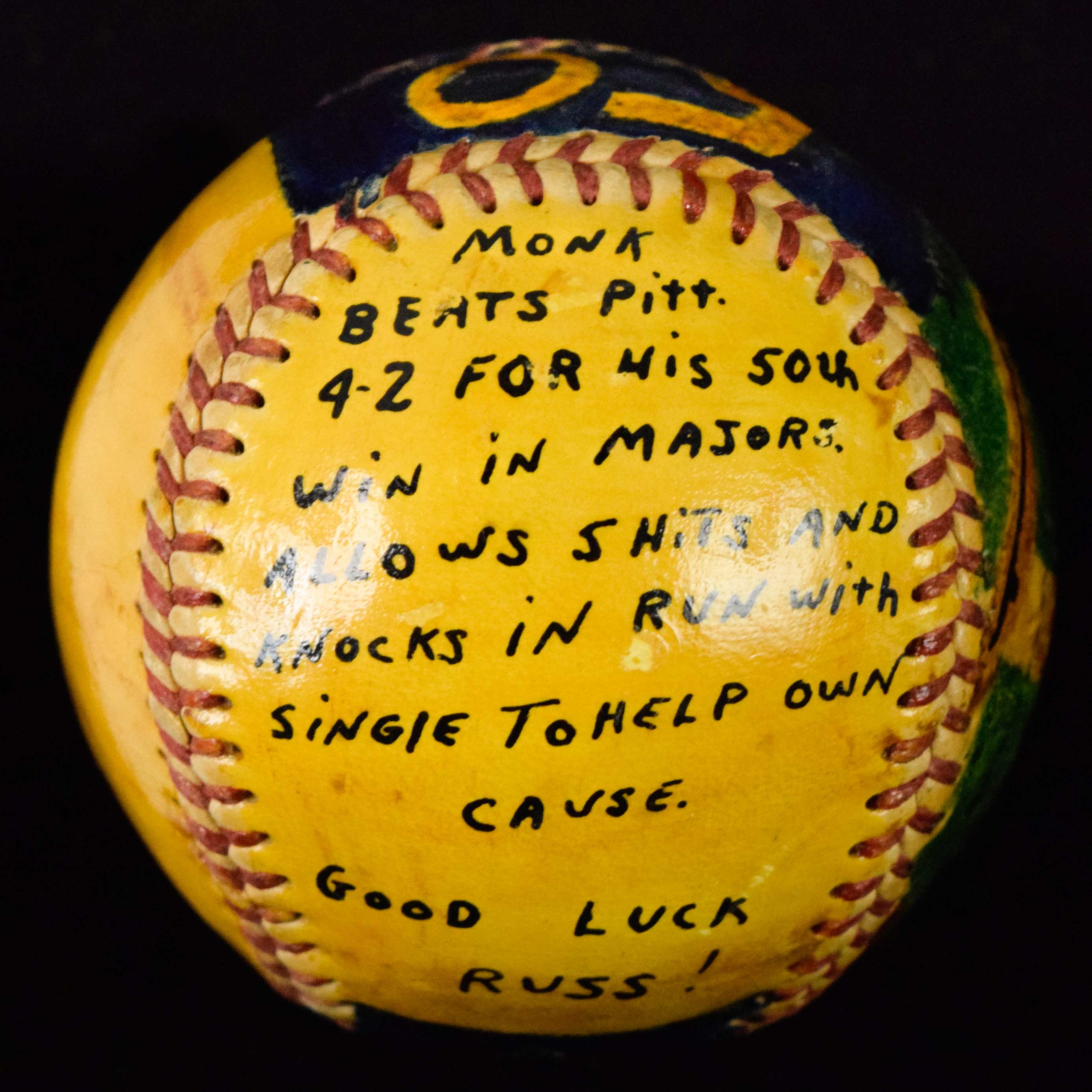 Description:6/14/1952 hand painted Russ Meyer 50th career win baseball (EX/MT). Colorfully painted along with text including "Monk Beats Pitt. 4-2 For His 50th Win in Majors. Allows 5 Hits And Knocks in Run With Single To Help Own Cause.", along with the date and other game info: EX/MT