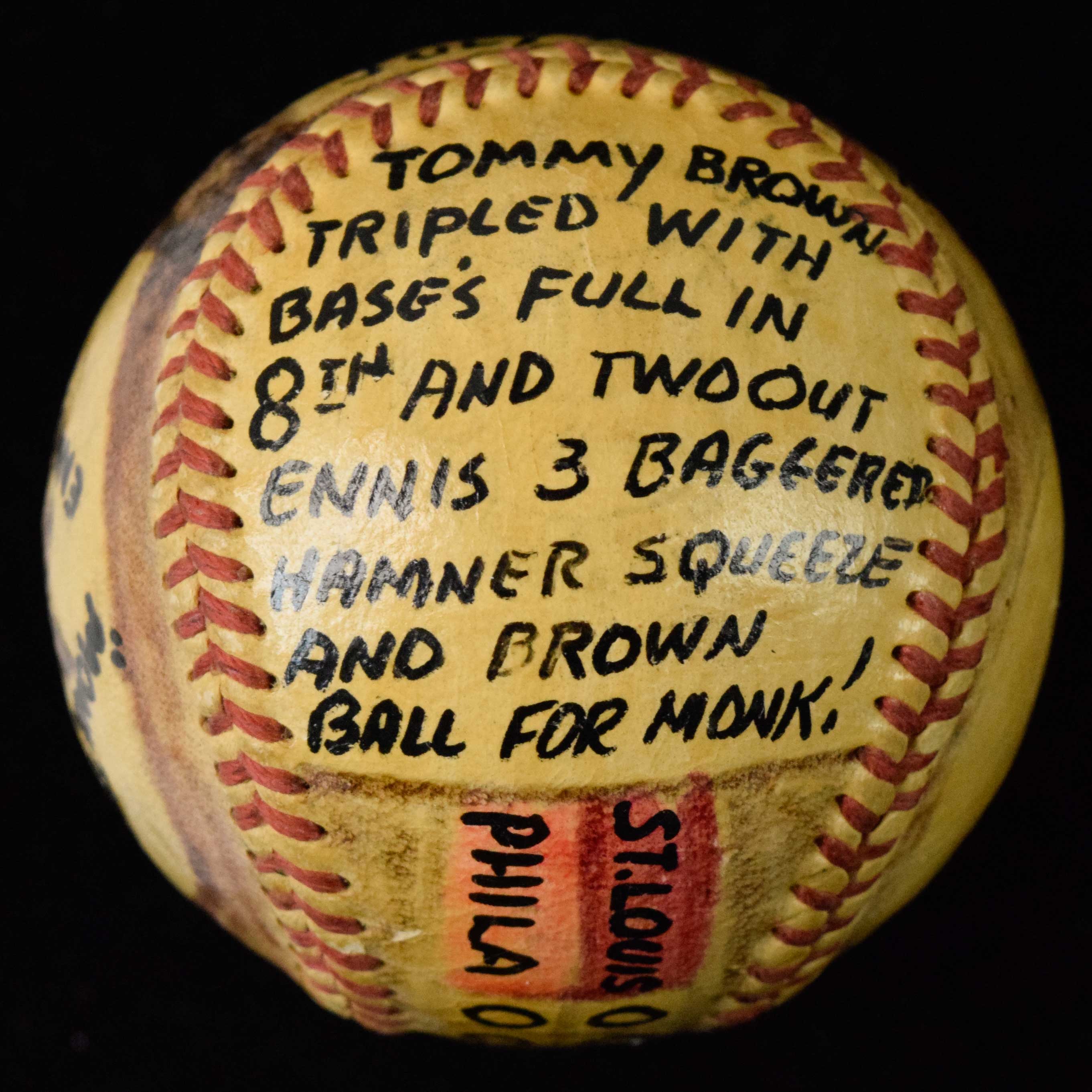 Description:7/16/1951 hand painted Russ Meyer season win #7 baseball (EX/MT). Colorfully painted along with text including a summary of the Phillies comeback win by scoring 5-runs in the 8th inning, along with the date and other game info: EX/MT