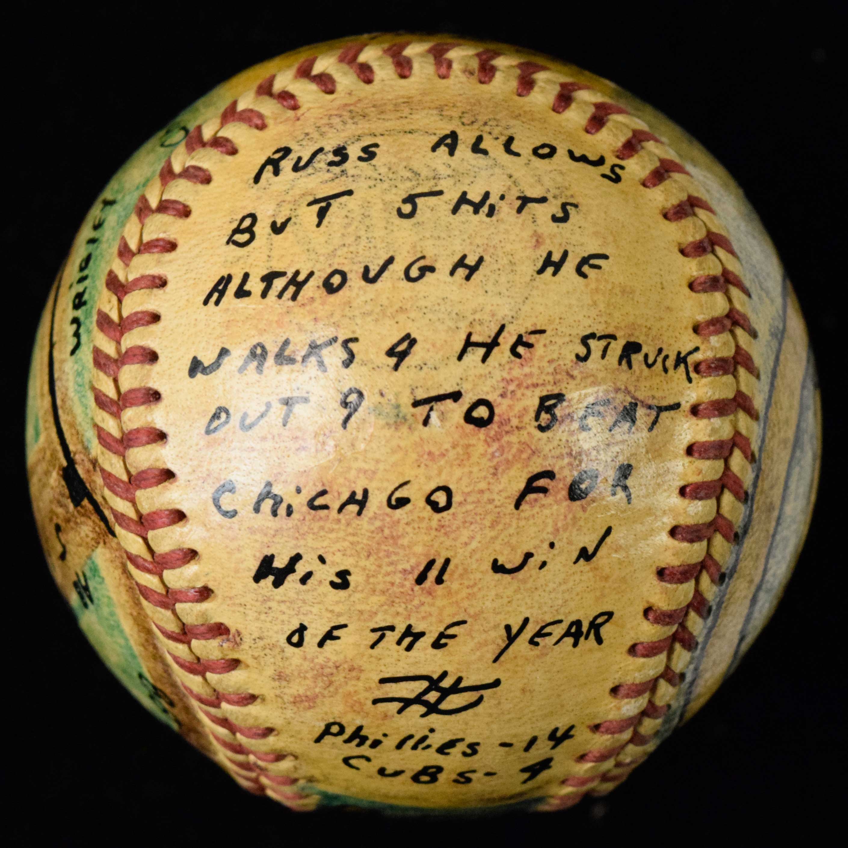 Description:8/24/1952 hand painted Russ Meyer season win #11 baseball (EX/MT). Colorfully painted along with text including "Russ Allows But 5 Hits Although He Walks 4. He Struck Out 9 To Beat Chicago...", along with the date and other game info: EX/MT