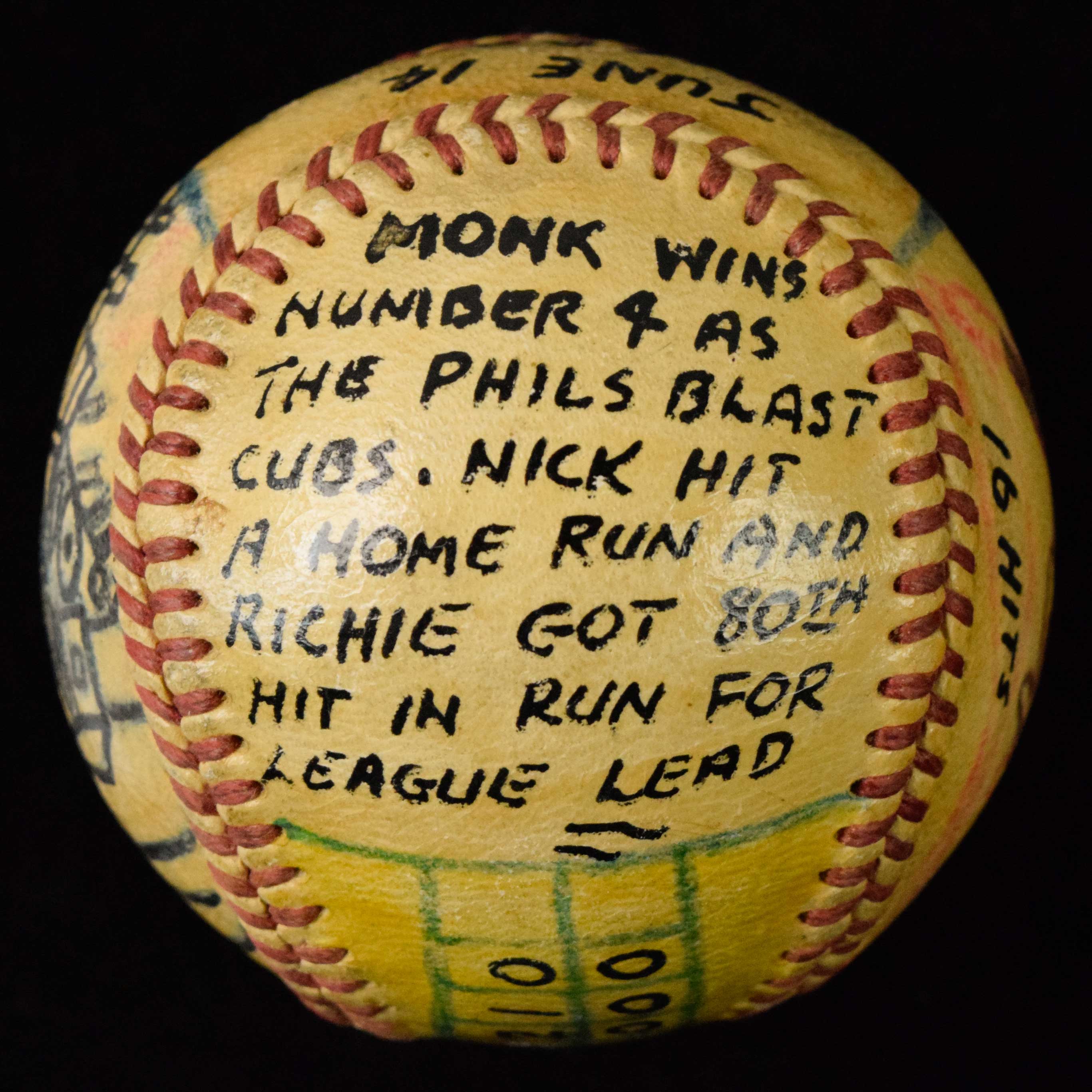 Description:6/14/1951 hand painted Russ Meyer season win #4 baseball (EX/MT). Colorfully painted along with text including "Monk Wins Number 4 As The Phils Blast Cubs. Nick Hit A Home Run And Richie Got 80th Hit In Run For League Lead", along with the date and other game info: EX/MT
