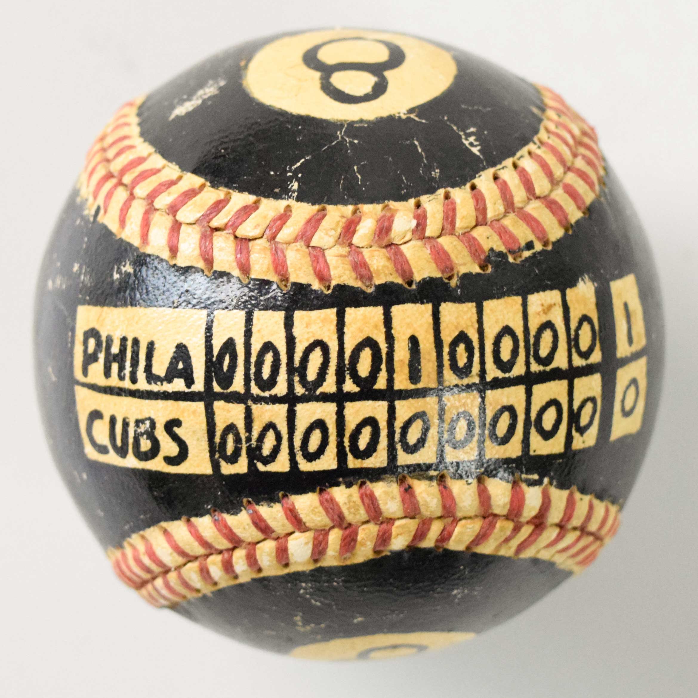 Description:7/28/1951 hand painted Russ Meyer season win #8 baseball (EX/MT). Painted in the likeness of a #8 billiards ball, with a line score of the 1-0 victory over the Chicago Cubs painted across the sweet spot: EX/MT