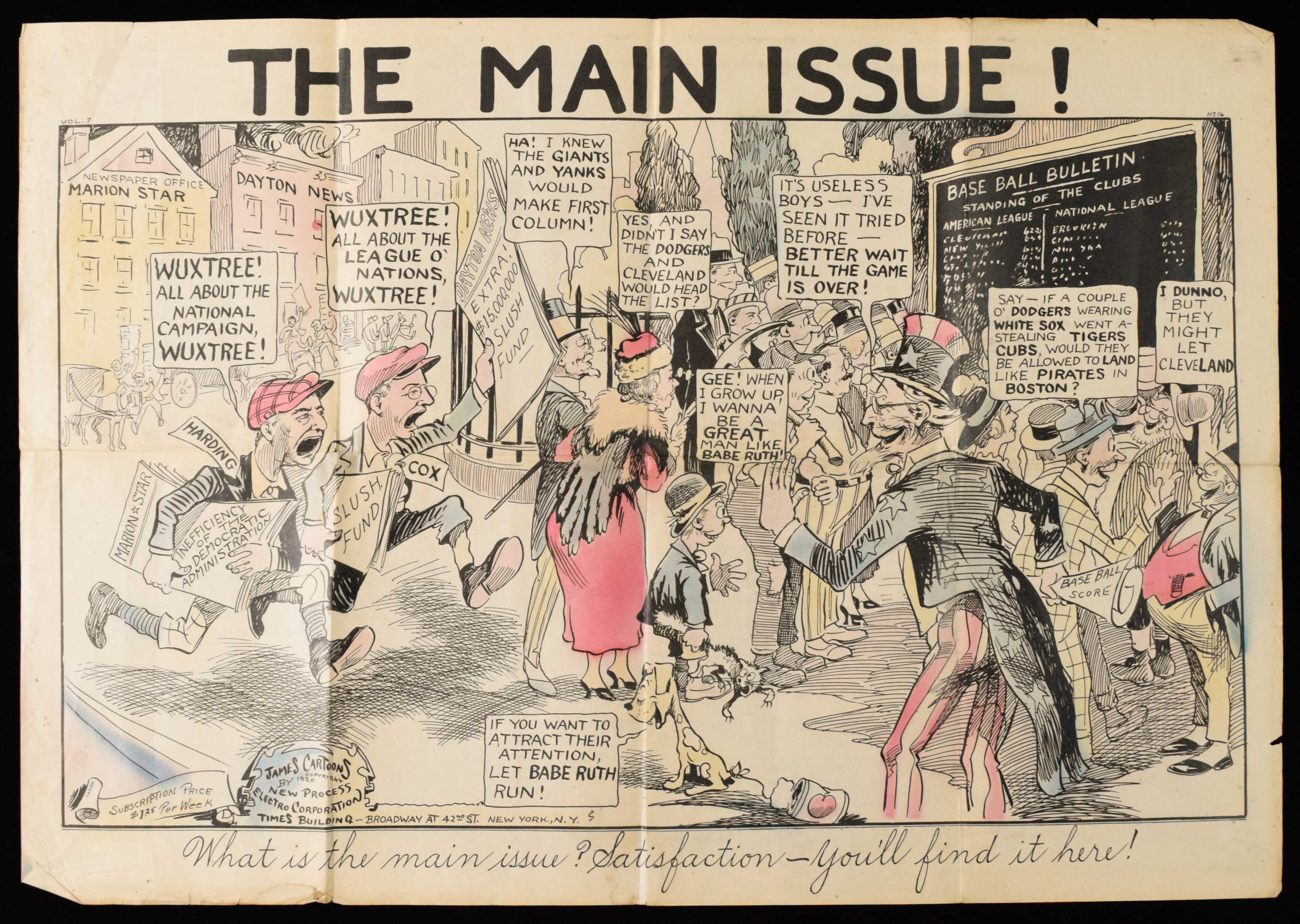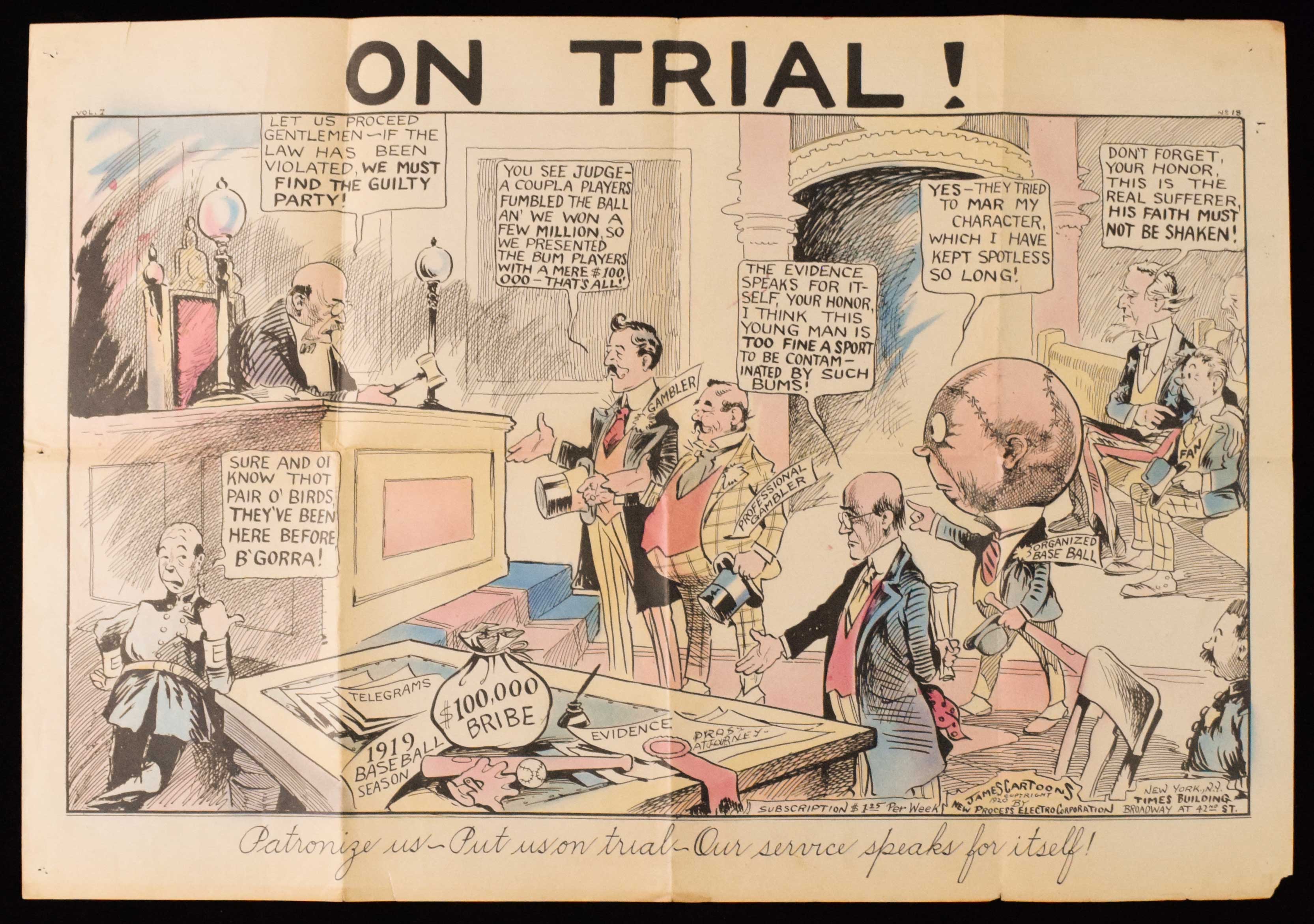Description:Lot of (2) rare c.1920 "James Cartoons" posters with 1919 World Series and Babe Ruth content (see description) Pair of rare oversized approx. 21.5"x31" paper stock posters are each marked "James Cartoons Copyright 1920 by New Process Electro Corporation…New York, N.Y. Times Building." The first is titled "On Trial!" and clearly relates to the Black Sox Scandal with the evidence table including a bribe, bat and ball, and "1919 Baseball Season" text. The other is titled "The Main Issue!" and shows Uncle Sam explaining to a pair of kids selling newspapers that they may as well wait until the days' baseball game is over. Text throughout relates to Babe Ruth. Both posters have fold lines and moderate wear throughout and the Ruth related piece has a tear to one corner. Much of the most notable wear (but not all) could likely be matted out when framed for display. Fold lines would remain visible: see description ($500-$1,000)
