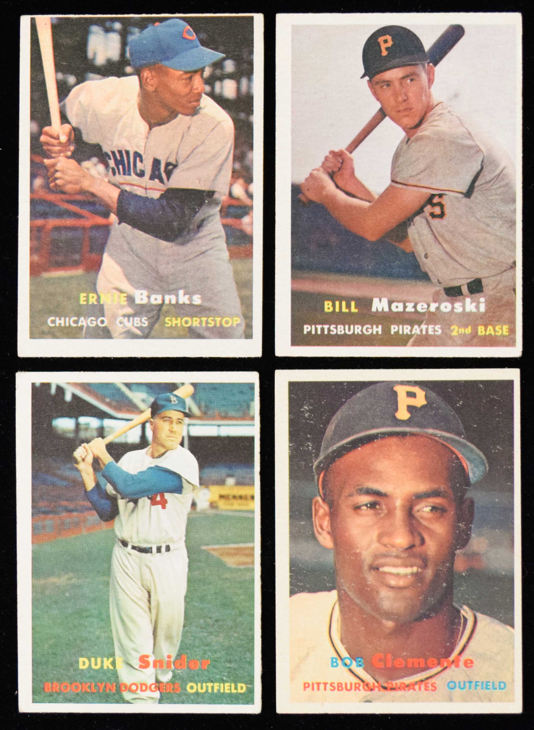 Lot of (10) 1957 Topps Hall of Famers incl. Clemente (GD-VG, Mays PR) Includes #10 Mays (PR, tears in side), 24 Mazeroski (VG), 25 Ford (GD), 30 Reese (VG/EX, wax on front), 55 Banks (GD), 70 Ashburn (GD/VG), 76 Clemente (VG/EX), 85 Doby (GD), 125 Kaline (VG), and 170 Snider (VG):