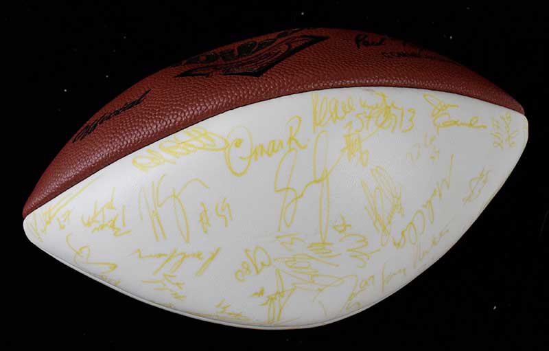 Description:1994 Green Bay Packers team signed football from the Reggie White collection (EX). Wilson NFL 75th anniversary white panel football signed by approx. (65) members of the 1994 Packers including Reggie White (missing Favre). Signatures rate 5/6 to 8 (avg 7) out of 10. Includes certificate of provenance from the White Family. The ball is not fully inflated, and would likely need a new bladder in order to be inflated: EX
