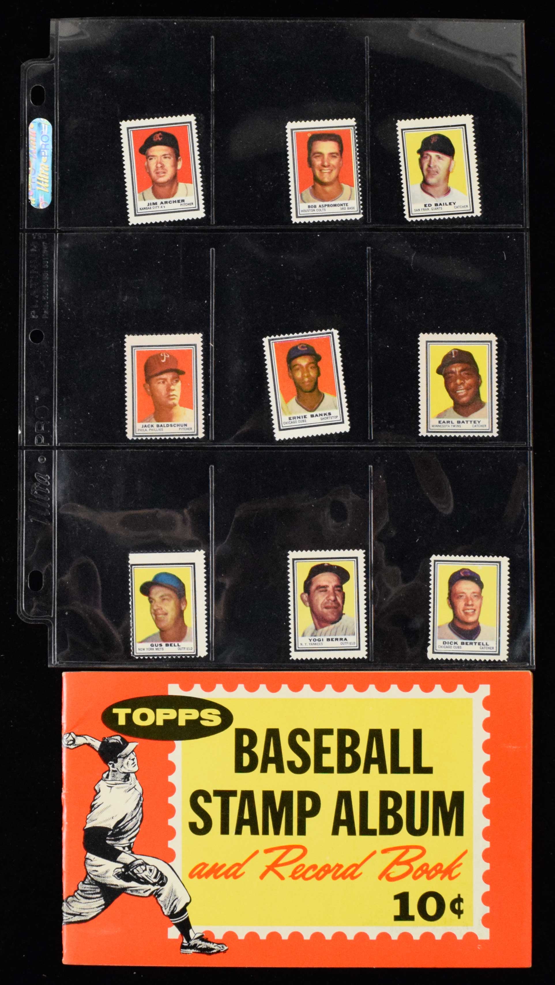 1962 Topps baseball stamps near complete set with album (FR/GD-NM/MT). Only missing (9) commons: Face, Fairly, Fornieles, Francona, Freese, Gonzalez, Hansen, Held, and Stuart. Key stamps grade: Hank Aaron (EX/MT), Clemente (EX/MT), Sandy Koufax (EX-EX/MT), Mickey Mantle (EX/MT), Willie Mays (GD), Stan Musial (EX/MT-NM). Remainder appear to average EX-EX/MT overall. Includes unused album (NM). Range: FR/GD-NM/MT