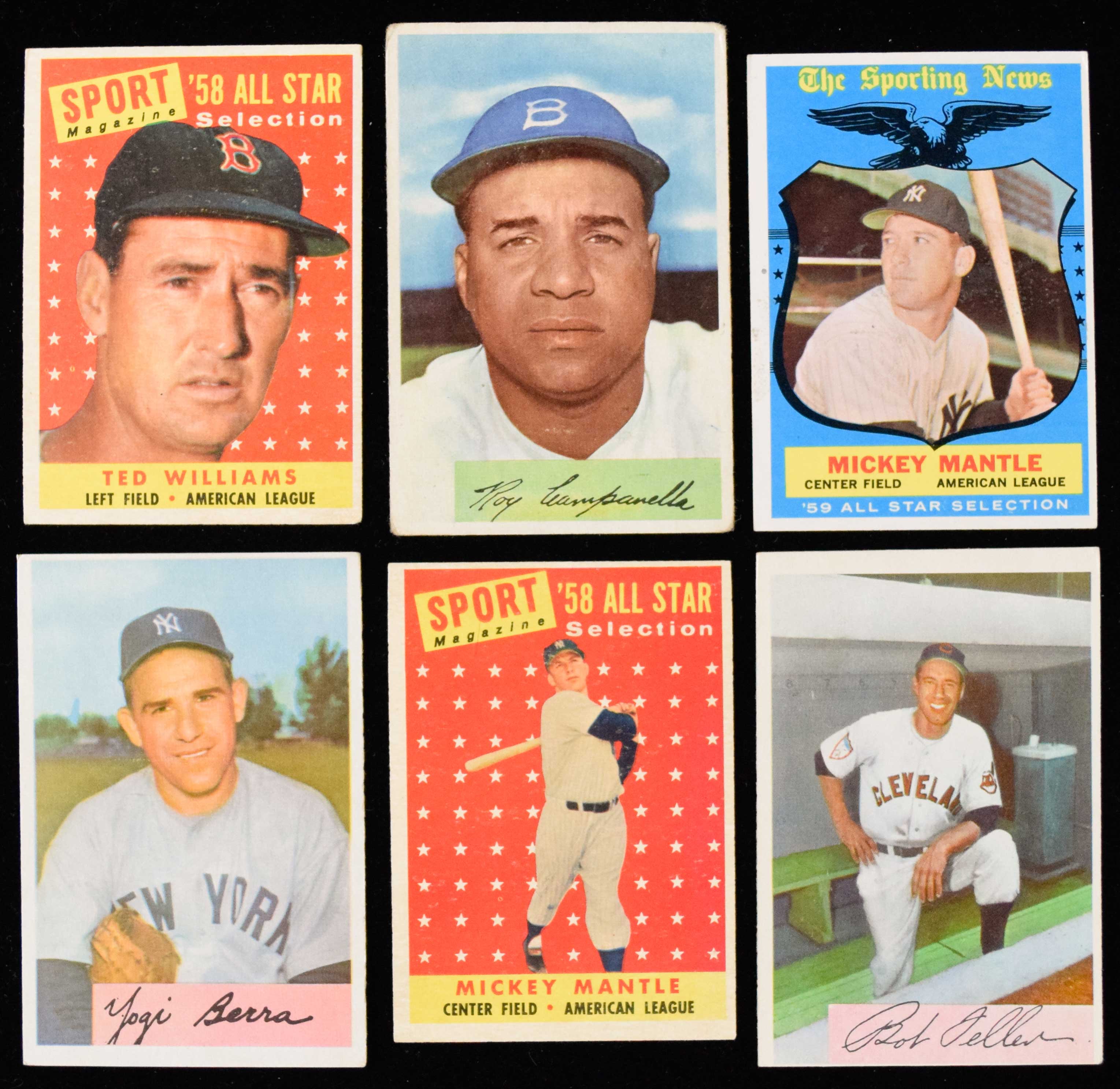 Description:Lot of (10) 1954-1959 Topps and Bowman Hall of Famers (2 Mantles) (GD-EX) Includes 1954 Topps #32 Snider (VG) and 37 Ford (EX); 1954 Bowman #58 Reese (VG/EX), 90 Campanella (GD/VG), 132 Feller (EX OC), and 161 Berra (EX); 1958 Topps #485 Williams (EX) and 487 Mantle (EX-EX/MT slightly OC), 1959 Topps #543 Outfield Trio (GD) and 564 Mantle (EX, wax on front): GD-EX