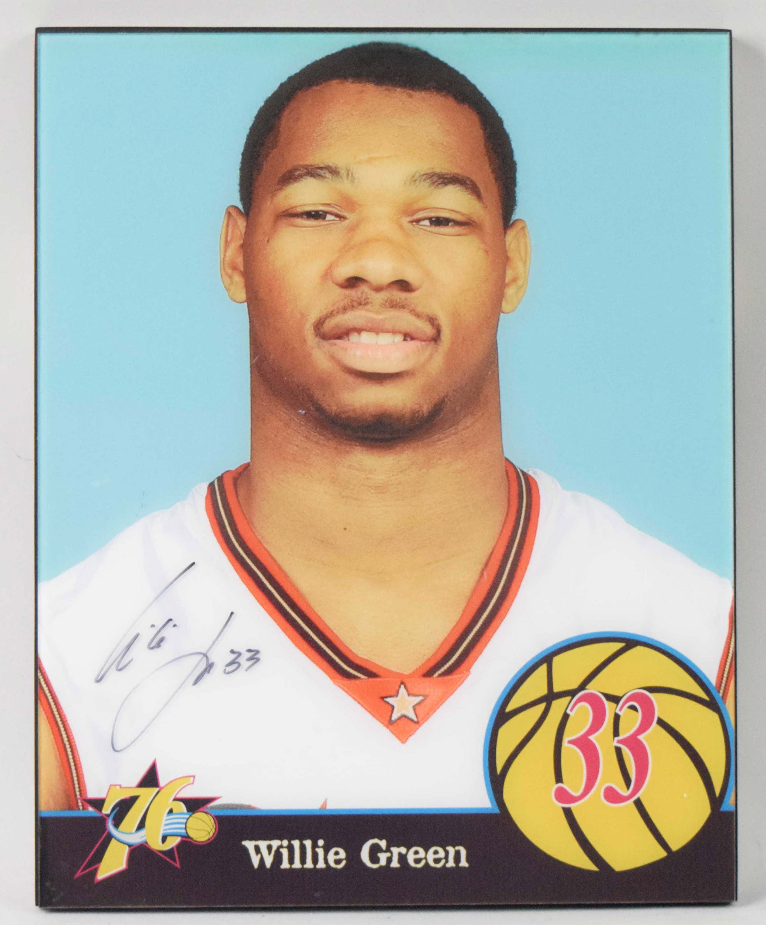 Description:Willie Green signed placard from the Wachovia / Wells Fargo Center (NM). 16"x20" plexi photo with wooden back signed by Green in black marker. Signature rates 8 out of 10: NM