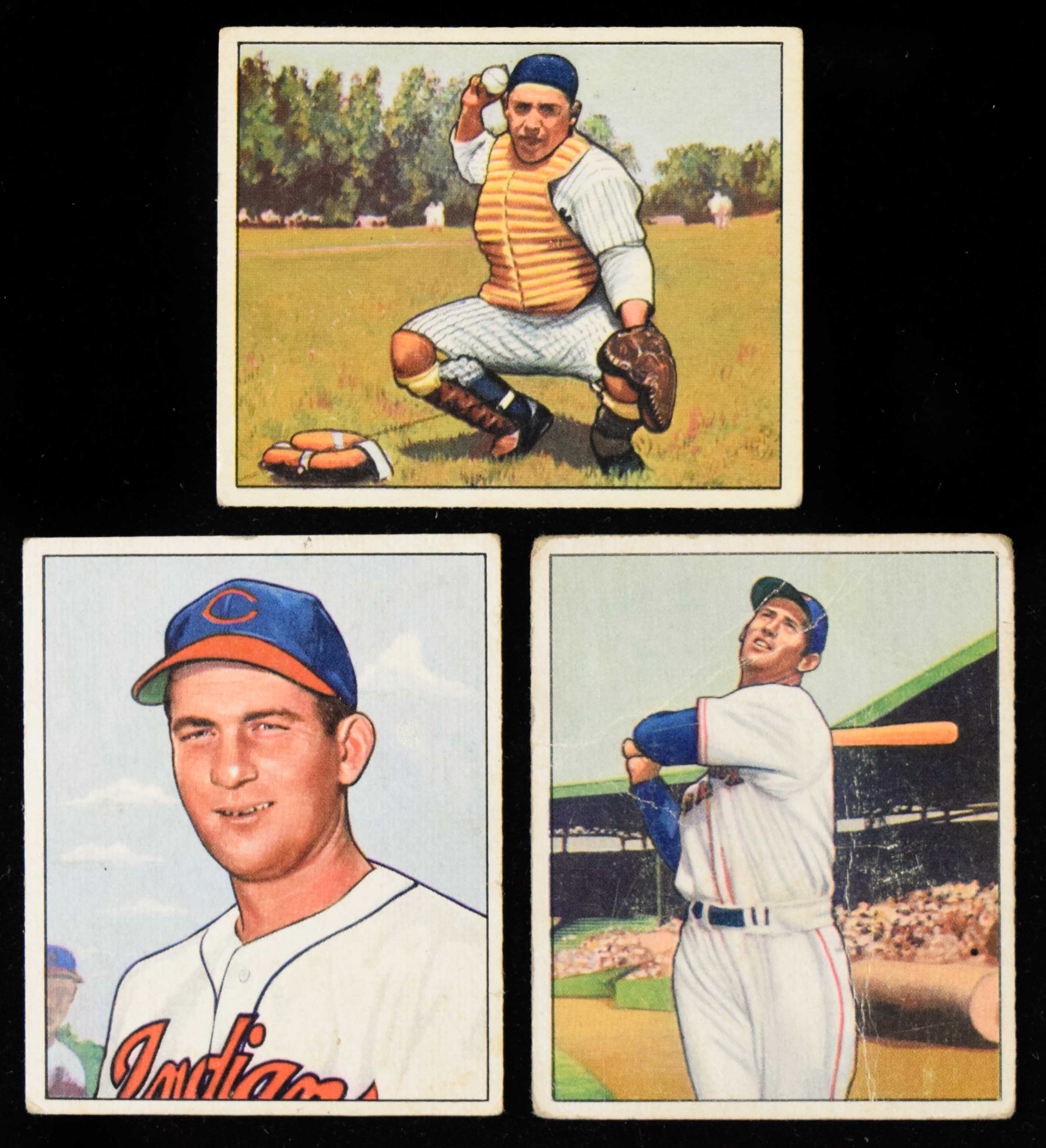 Description:Ted Williams, Yogi Berra, and Bob Lemon 1950 Bowman Baseball cards (GD-VG/EX). Includes #s 40 Bob Lemon (VG), 46 Yogi Berra (VG-VG/EX), and 98 Ted Williams (GD).