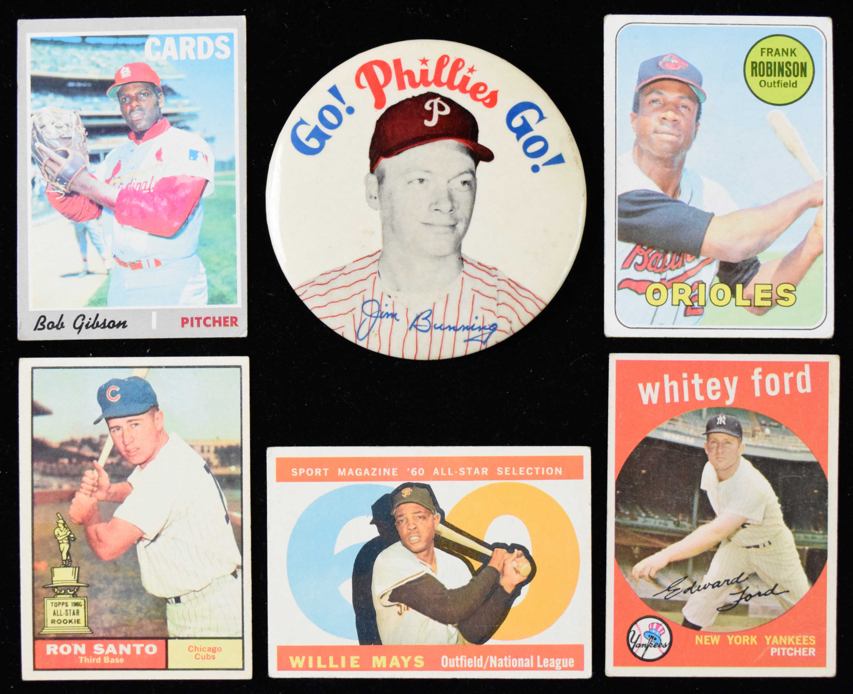 Description:Lot of (29) stars & HOFers baseball cards from 1958-1970 plus vintage Jim Bunning pin (FR/GD-EX/MT). Includes 1958 Hires Root Beer #s 42 Podres and 73 Worthington (FR/GD-GD no tabs); 1959 Topps #s 30 Nellie Fox, 34 Kaline/Maxwell, (2) 147 Cubs Clubbers, 155 Enos Slaughter, 260 Early Wynn, 270 Hodges, 310 Luis Aparicio, 408 Fox/Aparicio, and 430 Whitey Ford; 1960 Topps #s 240 Aparicio and 564 Willie Mays; 1961 Topps #s 1 Groat, (2) 35 Ron Santo rookies, 180 Richardson, 265 Tony Kubek, and 406 Mickey Mantle (FR/GD); 1968 Topps #s 40 McLain, 99 Colavito, and 310 Aparicio; 1969 Topps #s 250 Frank Robinson and 425 Carl Yastrzemski; 1970 Topps #s 449 Jim Palmer, 455 Brooks Robinson, 463 Frank Robinson, and 530 Bob Gibson. Most cards appear to average VG overall. Also includes c.1964 Jim Bunning pin (EX/MT). Range: FR/GD-EX/MT