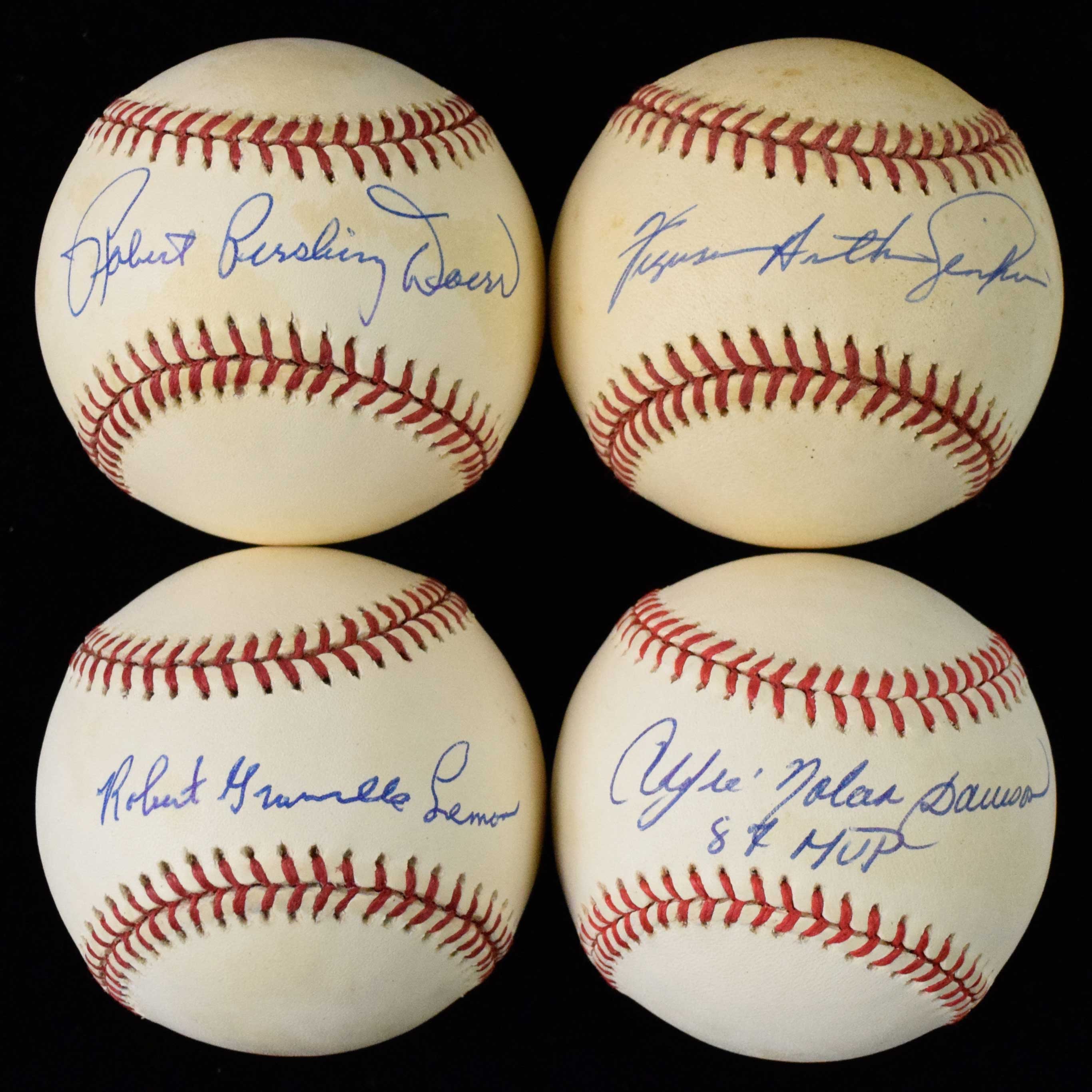 Description:Lot of (5) HOFers full name signed baseballs (VG-EX/MT). Includes G.Budig AL ball signed by Robert Pershing Doerr, G.Budig AL ball signed by Robert Granville Lemon, L.Coleman NL ball signed by Andre Nolan Dawson with "87 MVP" inscription, G.Budig AL ball signed by Brooks Calbert Robinson, and L.Coleman NL ball signed by Ferguson Arthur Jenkins. Signatures rate 6/7 (Robinson) to 9/10 (avg 8) out of 10. Most balls appear to average EX overall due to various degrees of toning (Lemon least toned, Jenkins most toned): VG-EX/MT