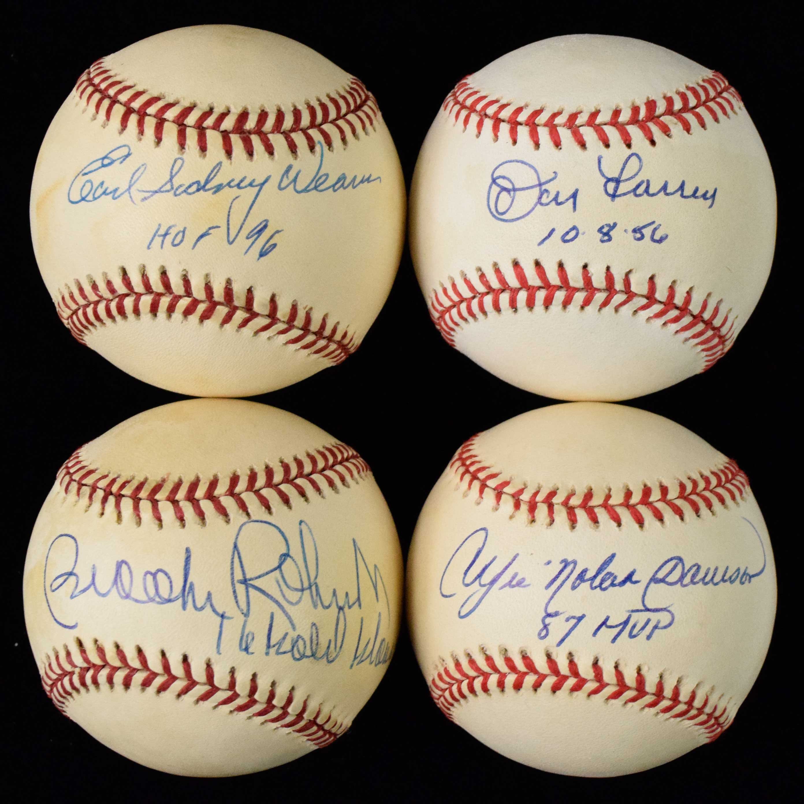 Description:Brooks Robinson, Andre Dawson, Earl Weaver, Don Larsen signed & inscribed baseballs (VG/EX-EX/MT). Includes G.Budig AL ball (toned) signed by Brooks Robinson with "16 Gold Gloves" inscription, L.Coleman NL ball (light toning) signed by Andre Nolan Dawson with "87 MVP" inscription, G.Budig AL ball (toning) signed by Earl Sidney Weaver with "HOF 96" inscription, and G.Budig AL ball (toning) signed by Don Larsen with "10-8-56" perfect game date inscription. Signatures rate 7/8 to 9/10 out of 10: VG/EX-EX/MT