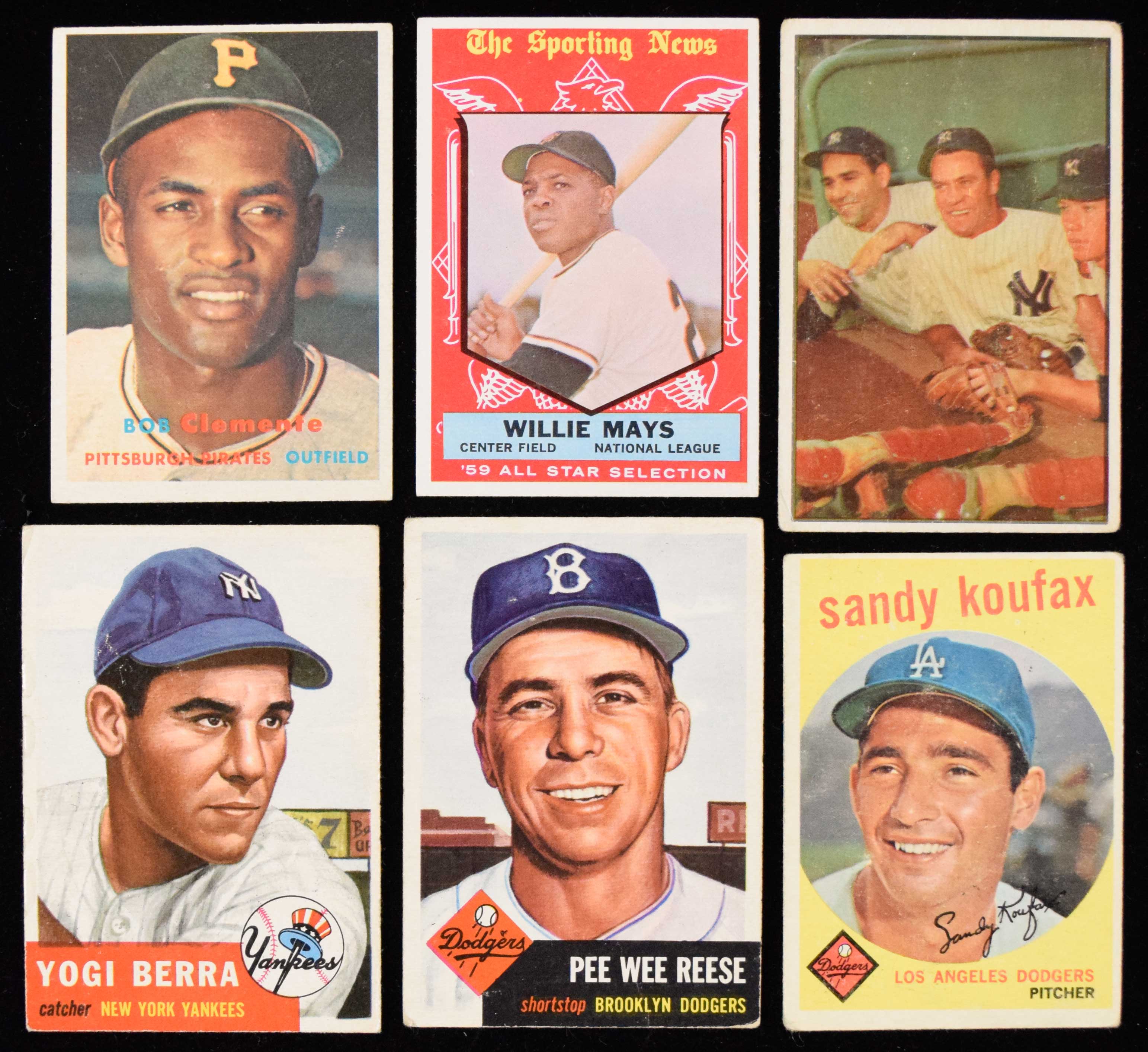 Lot of (8) 1953-1959 Topps and Bowman Hall of Famers (FR/GD-EX) Includes 1953 Topps #76 Reese (GD/VG) and 104 Berra (FR/GD-GD); 1953 Bowman Color #44 Mantle/Berra/Bauer (GD); 1954 Bowman #177 Ford (VG/EX); 1955 Bowman #134 Feller (VG OC); 1957 Topps #76 Clemente (VG/EX); 1959 Topps #163 Koufax (GD) and 563 Mays (EX): FR/GD-EX