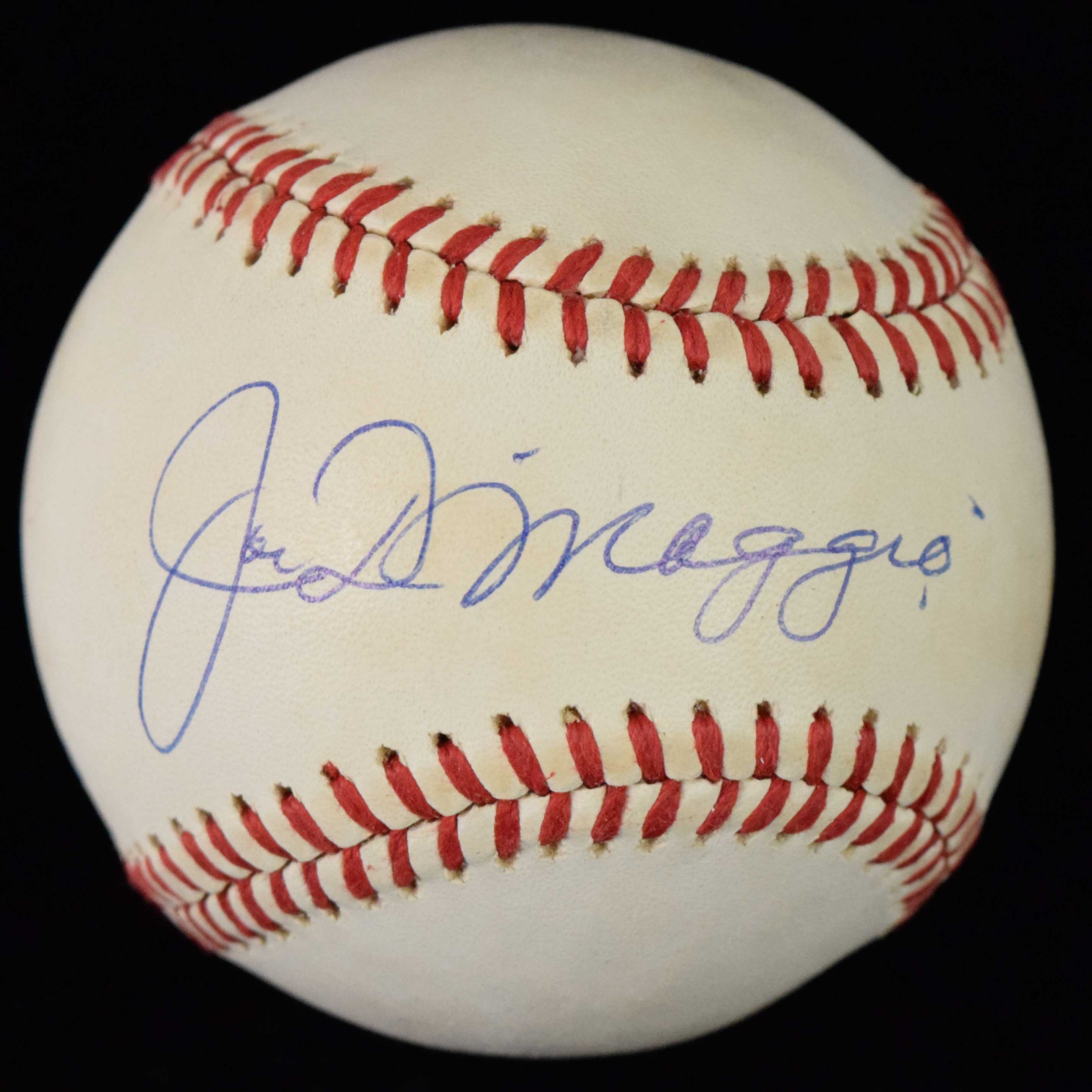 Description:Joe DiMaggio signed B.Brown AL baseball (EX/MT). DiMaggio signed the sweet spot in blue ink. Signature rates 9 out of 10. Minor toning across the signed sweet spot: EX/MT