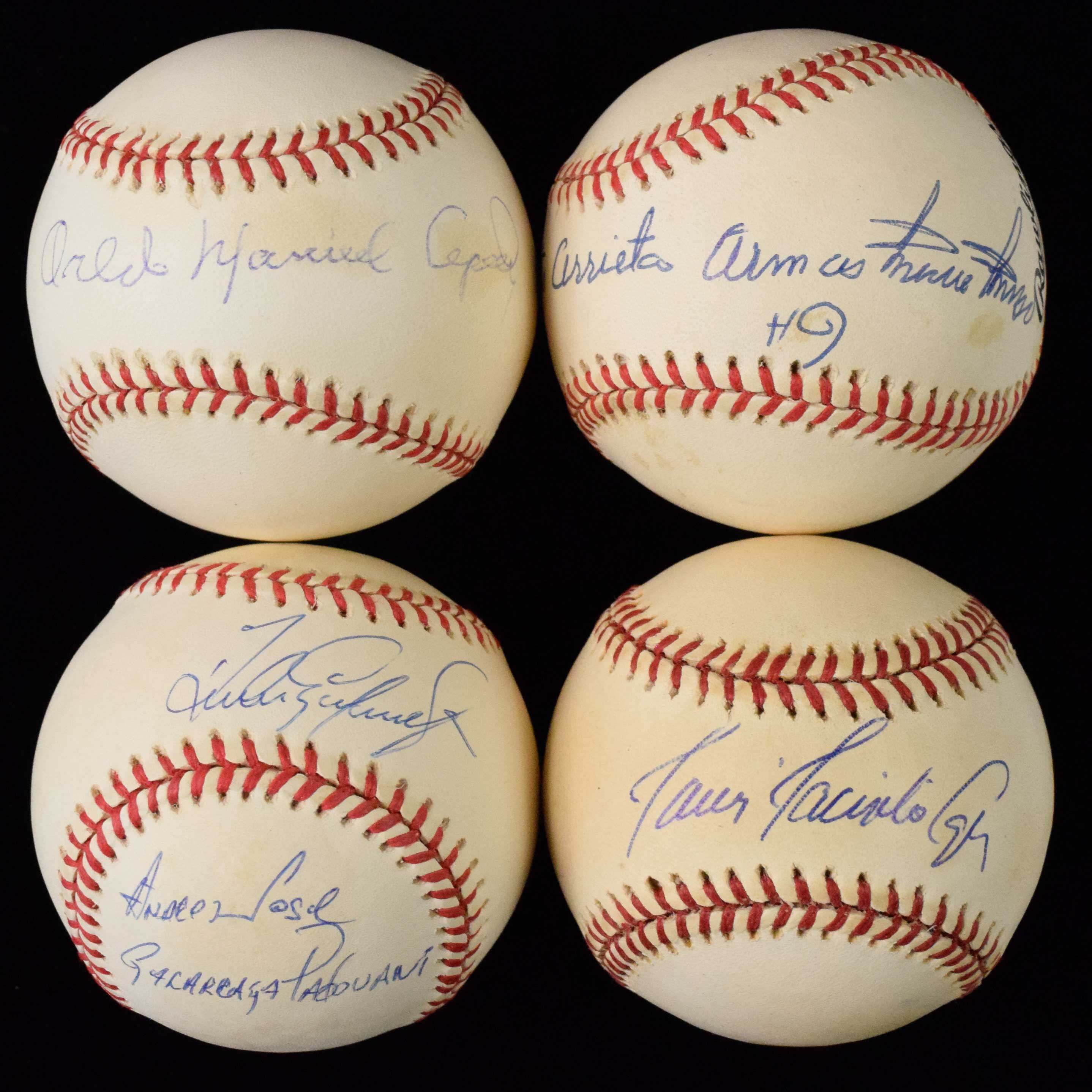 Description:Orlando Cepeda, Minnie Minoso, Andres Galarraga, Javy Lopez full name signed baseballs (EX-EX/MT). Includes L.Coleman NL ball signed by Orlando Manuel Cepeda, L.Coleman NL ball signed by Saturnino Orestes Armas "Minnie" Minoso, L.Coleman NL ball signed by Andres Jose Galarraga Padovani, and L.Coleman NL ball signed by Javier "Jacivlo" Lopez. Signatures rate 7 (Cepeda) to 9 out of 10. All have areas of light to moderate toning: EX-EX/MT