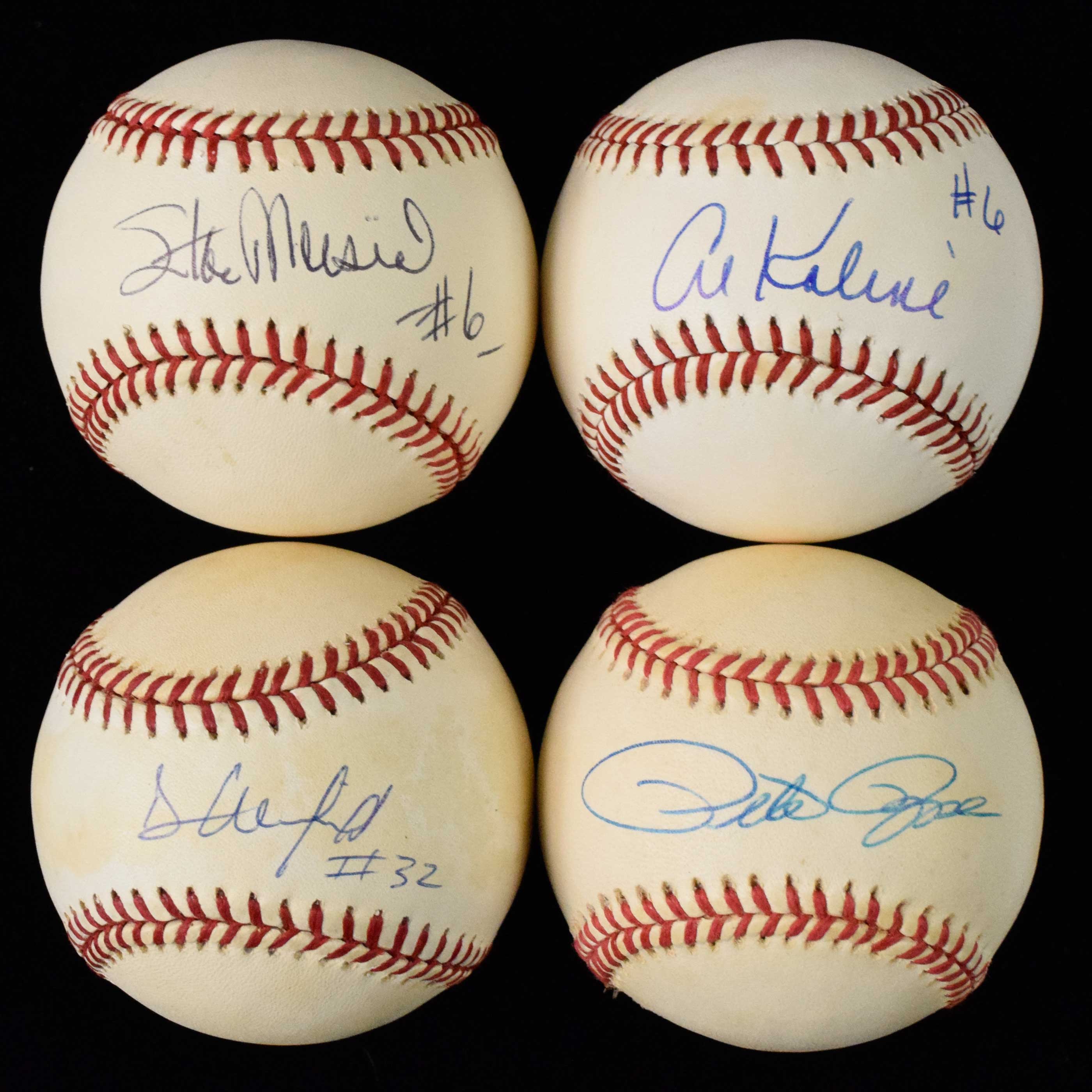 Description:Lot of (6) 3000 Hit Club single-signed baseballs (VG/EX-NM). Includes W.White NL ball signed by Stan Musial, B.Brown AL ball (light toning) signed by Al Kaline, G.Budig AL ball (toned) signed by Cal Ripken Jr, G.Budig AL ball (toning) signed by Dave Winfield, G.Budig AL ball (toning) signed by Eddie Murray, and W.White NL ball (toning) signed by Pete Rose. Signatures rate 7 (Murray) to 9/10 (avg 8) out of 10: VG/EX-NM