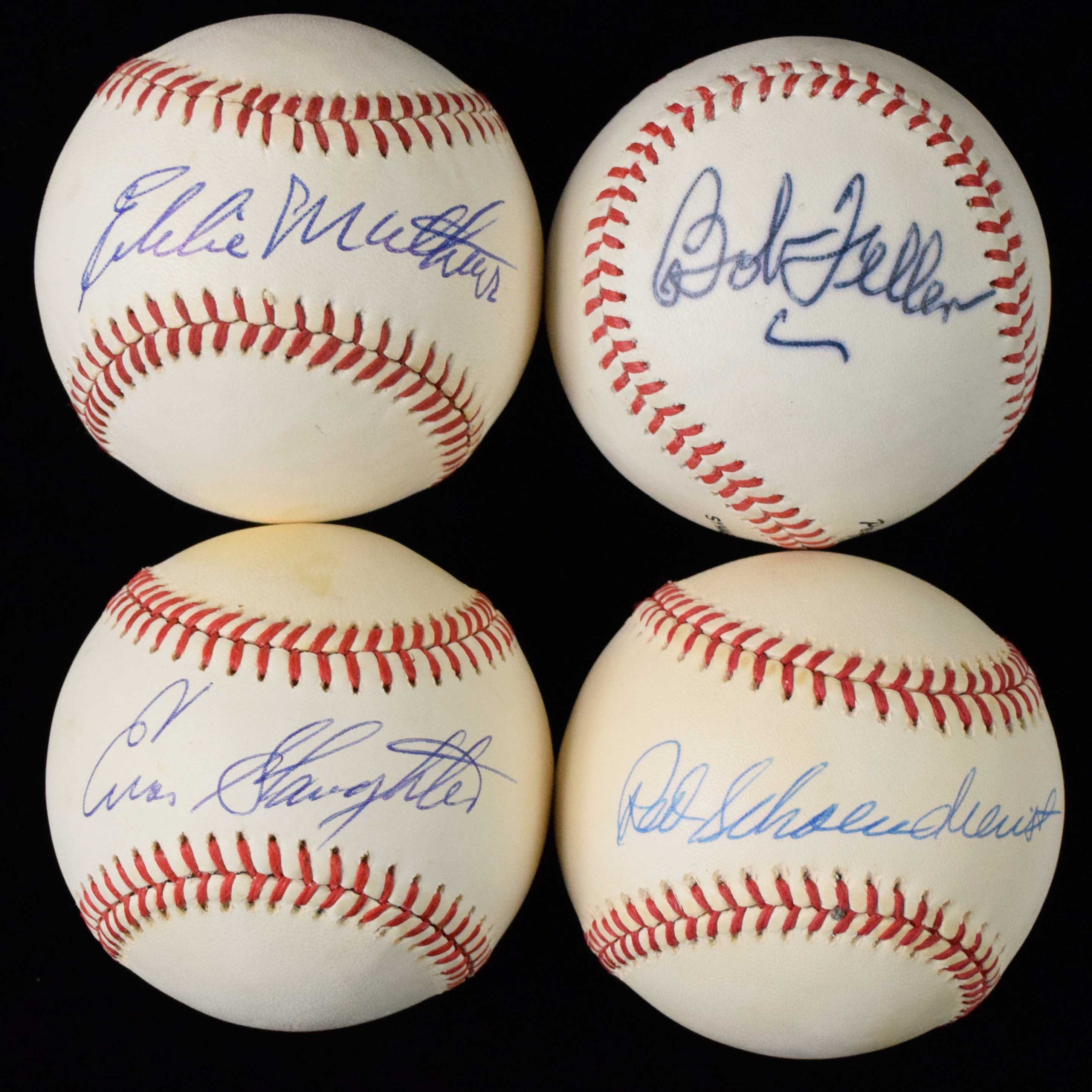 Description:Lot of (6) HOFers signed baseballs (VG/EX-NM). Includes B.Giamatti NL ball (light toning) signed by Eddie Mathews, Wilson Major League Specifications ball signed by Bob Feller, L.Coleman NL ball (light toning) signed by Red Schoendienst, B.Giamatti NL ball (toning) signed by Enos Slaughter, G.Budig AL ball (toning) signed by Eddie Murray, and L.Coleman NL ball (toned) signed by Bill Mazeroski. Signatures rate 7 (Murray) to 9/10 (avg 8) out of 10: VG/EX-NM