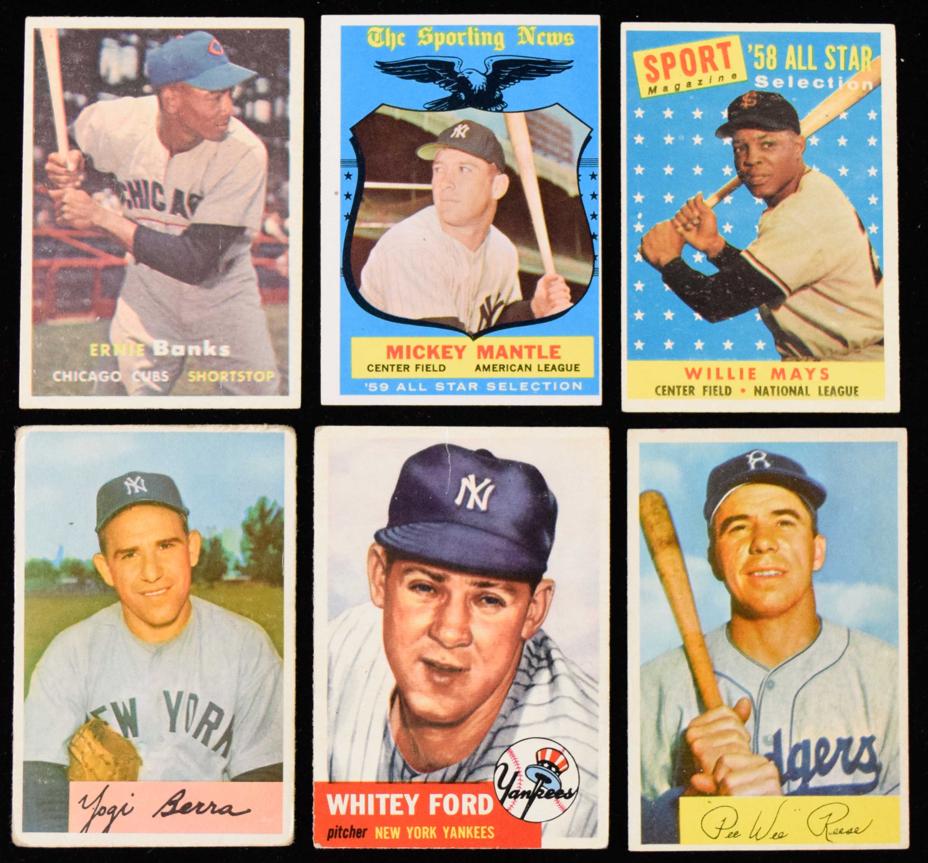 Lot of (10) 1953-1959 Topps and Bowman Hall of Famers (GD-EX) Includes 1953 Topps #207 Ford (GD/VG); 1954 Topps #32 Snider (EX-EX/MT OC/Miscut); 1954 Bowman #58 Reese (VG/EX), 132 Feller (EX), 161 Berra (GD), and 170 Snider (VG/EX); 1957 Topps #55 Banks (VG/EX-EX); 1958 Topps #486 Mays (GD); 1959 Topps #550 Campanella (EX) and 564 Mantle (EX OC): GD-EX
