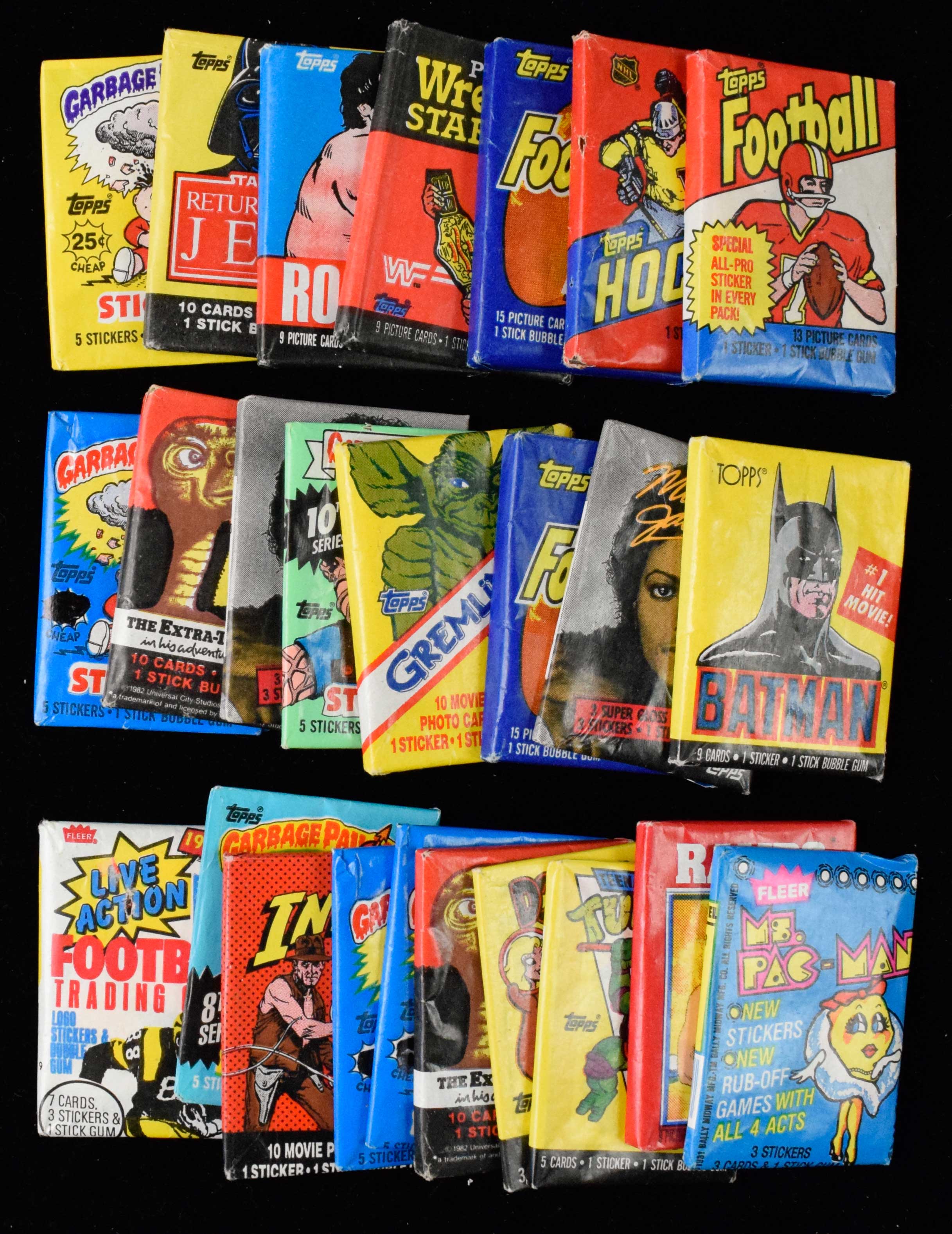 Lot of (31) sports and non-sports card wax packs from 1981-1990 (VG-NM). Baseball: 1981 Topps Scratch-Offs. Football: 1983 Topps, (2) 1984 Fleer, 1984 Fleer Team Action, and 1986 Fleer Team Action. Hockey: 1981-82 Topps. Wrestling: 1985 Topps WWF. Non-sports: 1981 Fleer Ms. Pac-Man Stickers, (2) 1982 Topps Donky Kong, (2) 1982 Topps E.T. The Extraterrestrial, 1983 Topps "Star Wars: Return of the Jedi", 1984 Topps Indiana Jones & the Temple of Doom, (2) 1984 Topps Michael Jackson, 1984 Topps Gremlins, 1985 Topps Rambo, (2) 1985 Topps Rocky IV, (3) 1985 Topps Garbage Pail KIds 2nd series, 1986 Topps Garbage Pail Kids 4th series, 1987 Topps Garbage Pail Kids 8th series, 1987 Topps Garbage Pail Kids 10th series, 1989 Topps Batman, (2) 1989 Topps Teenage Murant Ninja Turtles, and 1990 Topps Dick Tracy Movie. Most packs appear to average EX overall due to various degrees of handling/storage wear. Range: VG-NM