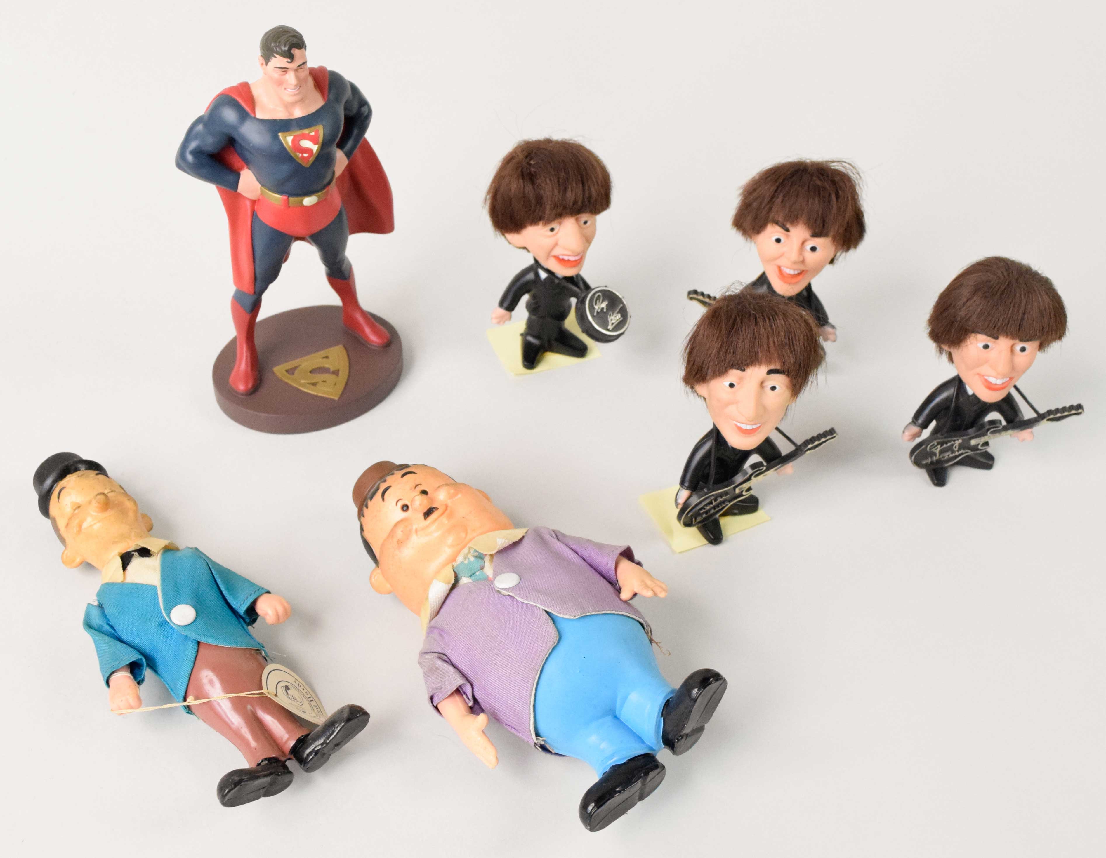 Description:Non-sports figures incl. 1964 Beatles set and Superman (VG-NM) Includes 1964 The Beatles set of (4) vinyl figures by Nems (some tape/mounting residue on feet); 1940s Rempel Frog figure (age wear/some minor cracking to material at ankles); Laurel and Hardy figures by Dakin plus Laurel and Hardy in small car; and Superman figure with 1999 copyright date. Varying degrees/types of wear throughout: VG-NM