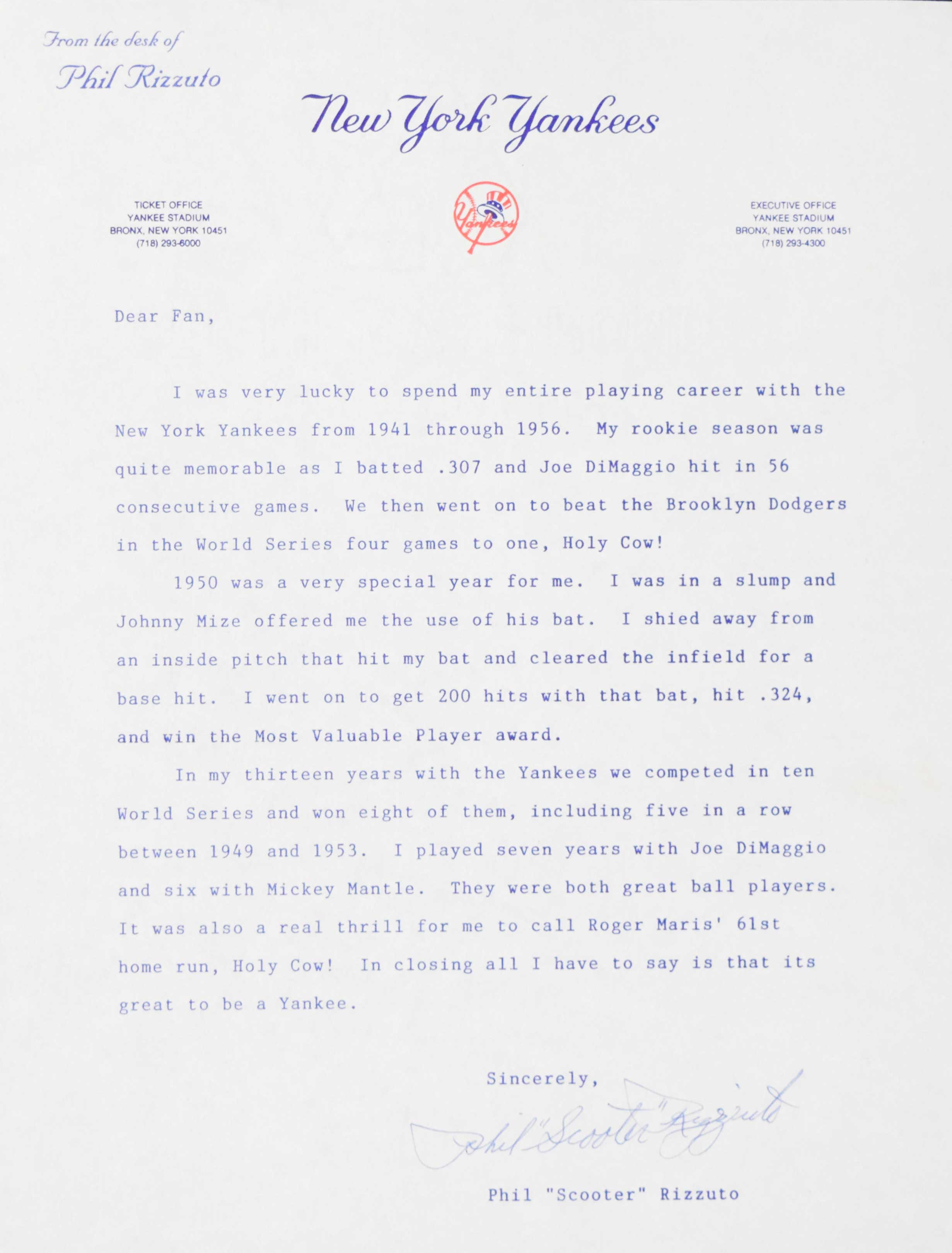 Description:Phil Rizzuto signed letter on Yankees stationary with fantastic content (NM) Typed letter with outstanding career related content has been signed in ink rating 8 out of 10: NM