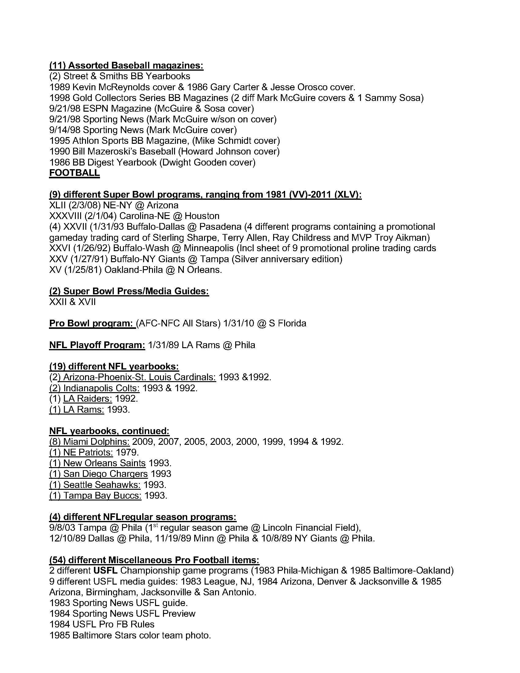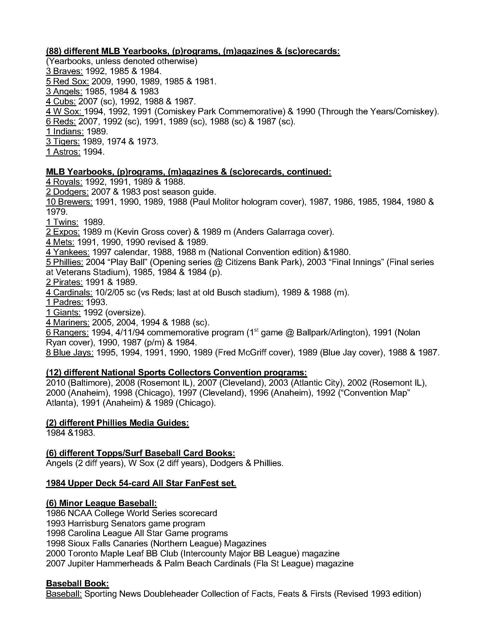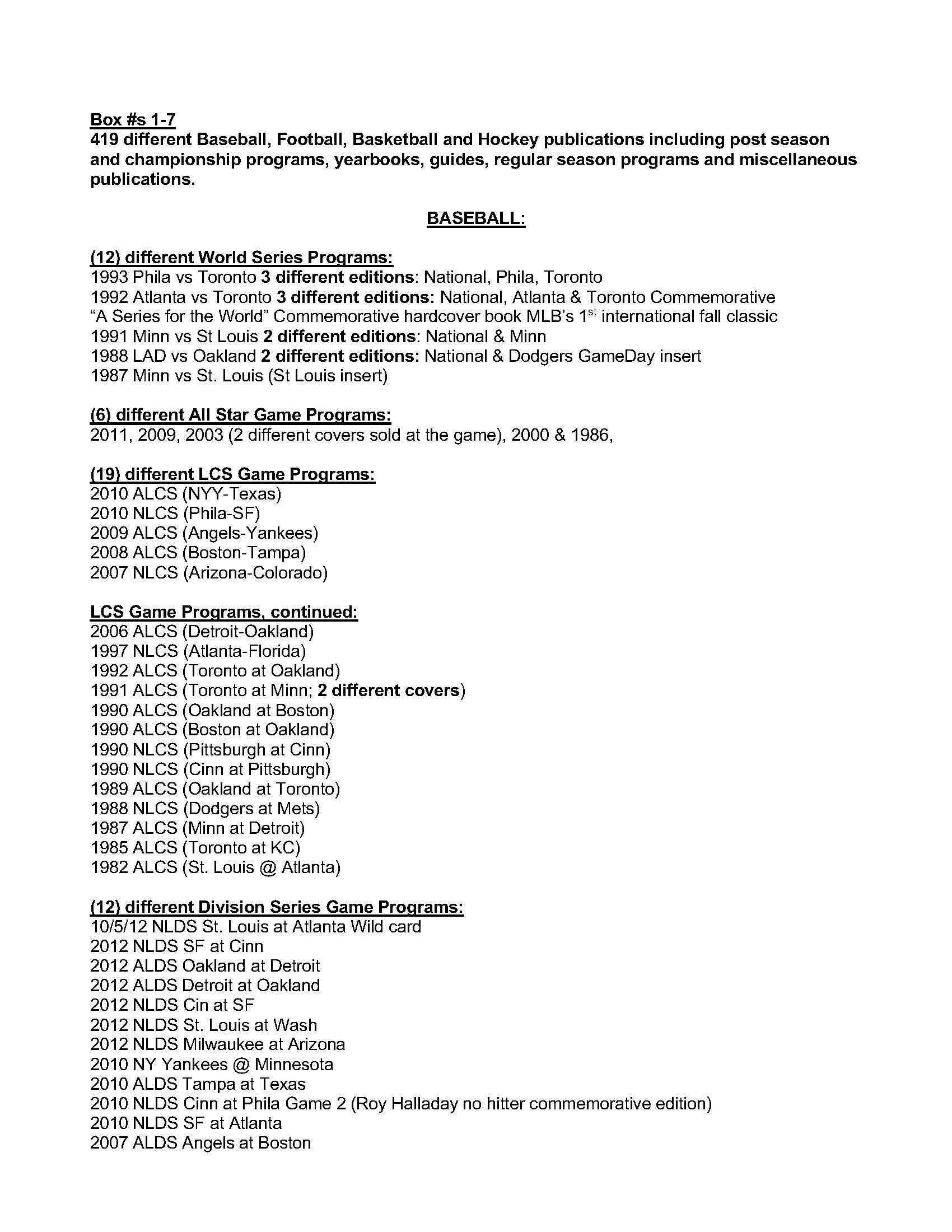 Description:Lot of (419) different Baseball, Football, Basketball and Hockey publications including post season and championship programs, yearbooks, guides, regular season programs and miscellaneous publications (VG/EX-MT) See Full List for details on the items. Includes (12) differet World Series programs between 1987-1993, (6) MLB All Star Game programs 1986-2011, (19) LCS programs 1982-2010, (12) Division Series programs 2007-2012, (88) MLB yearkbooks, (12) National Sports Collector Convention programs, (2) Phillies media guides 1983 and 1984, (6) Topps/Surf Baseball card books, (6) Minor league baseball scorecards and programs, (11) assorted baseball magazines, (9) Super Bowl Programs from 1981-2011, (2) SB Press/media Guides XXII and XVII, 2010 pro bowl program, 1989 Rams Eagles playoff program, (19) NFL yearbooks, (8) College postseaon program 1986-2008, (7) All Star and other special NHL programs, (2) NHL Gudies, (9) NBA ASG programs, (5) NBA Finals Programs 1994-2001, (15) NBA Yearbooks, (24) NBA Gudies, (9) NCAA Final Four programs, (7) College Basketbal regular season programs, (16) Sports Illustrated Magazines 1979-1992 and more. Most items are in EX-MT condition: VG/EX-MT
