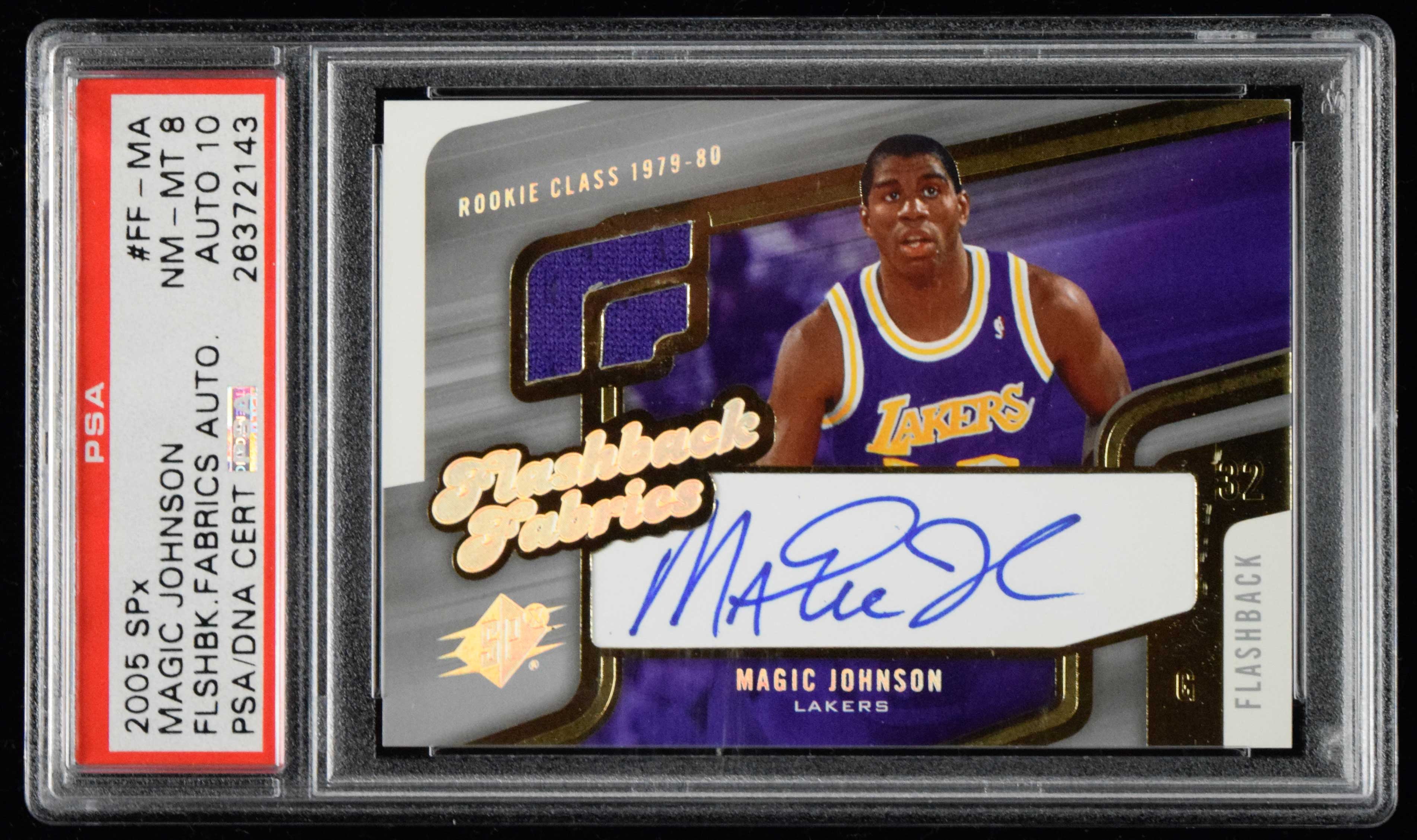 Description:Magic Johnson signed 2005-06 Upper Deck SPx relic swatch insert card with auto graded PSA/DNA 10 (NM/MT). 2005-06 SPx "Flashback Fabrics" #FF-MA signed by Johnson in blue fine tip marker. Encased within PSA/DNA holder with an autograph grade of 10, and card grade of 8: NM/MT