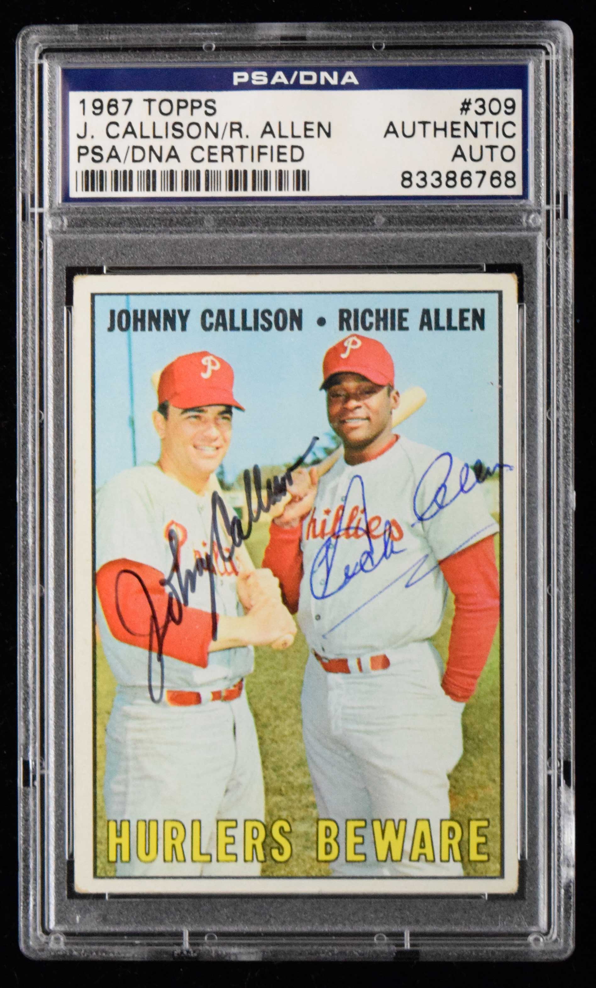 Description:Johnny Callison and Dick Allen dual-signed 1967 Topps Baseball card - PSA/DNA (EX). 1967 Topps #309 signed by Allen in blue ink and by Callison in black fine tip marker. Signatures rate 9 to 10 out of 10. Encased within PSA/DNA Authentic holder. Light corner wear: EX
