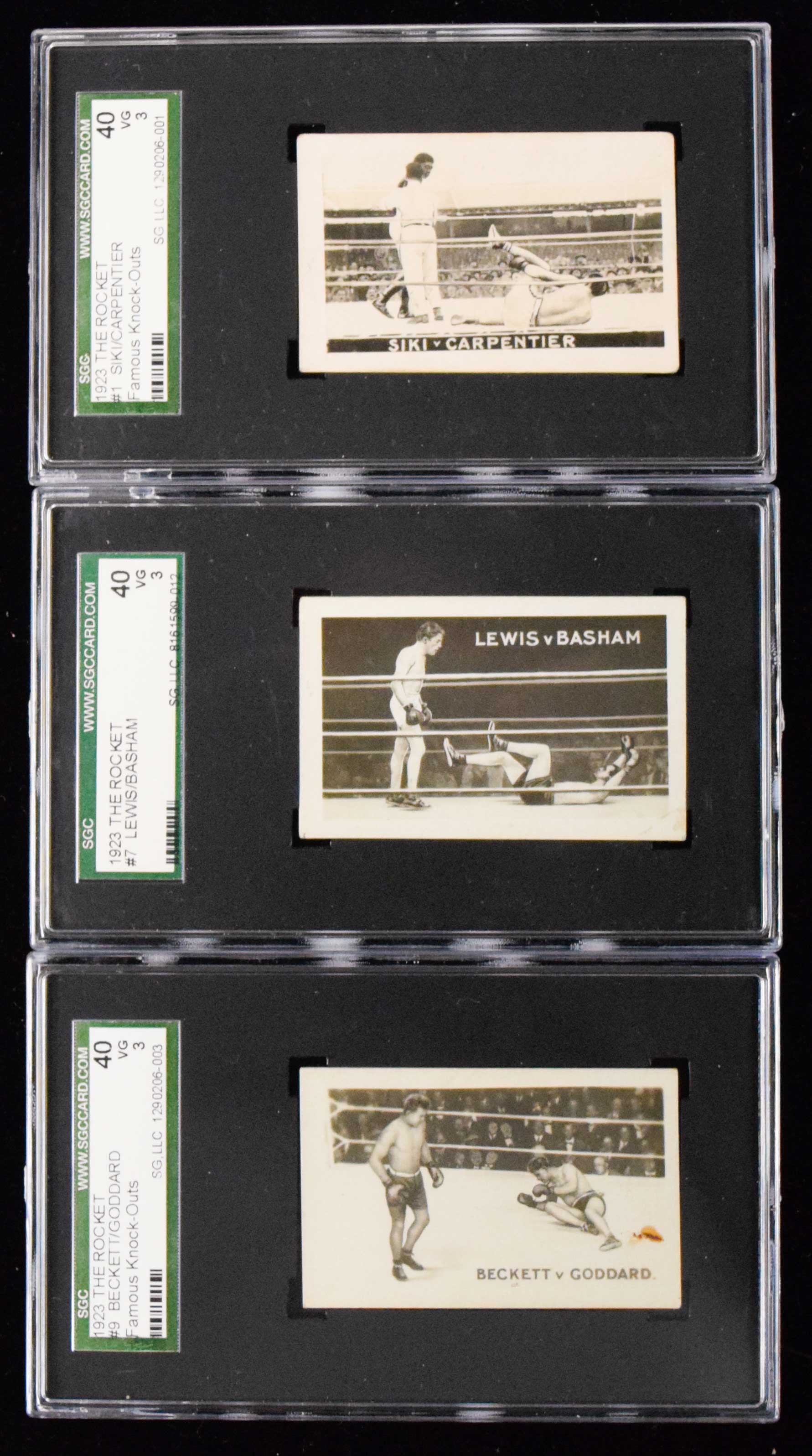 Description:1923 The Rocket "Famous Knock-Outs" boxing card set (GD-EX). Graded cards include #s 1 Siki/Carpentier (SGC 40 VG), 7 Lewis/Basham (SGC 40 VG), and 9 Beckett/Goddard (SGC 40 VG). The other (8) cards appear to average VG-VG/EX overall. Range: GD-EX