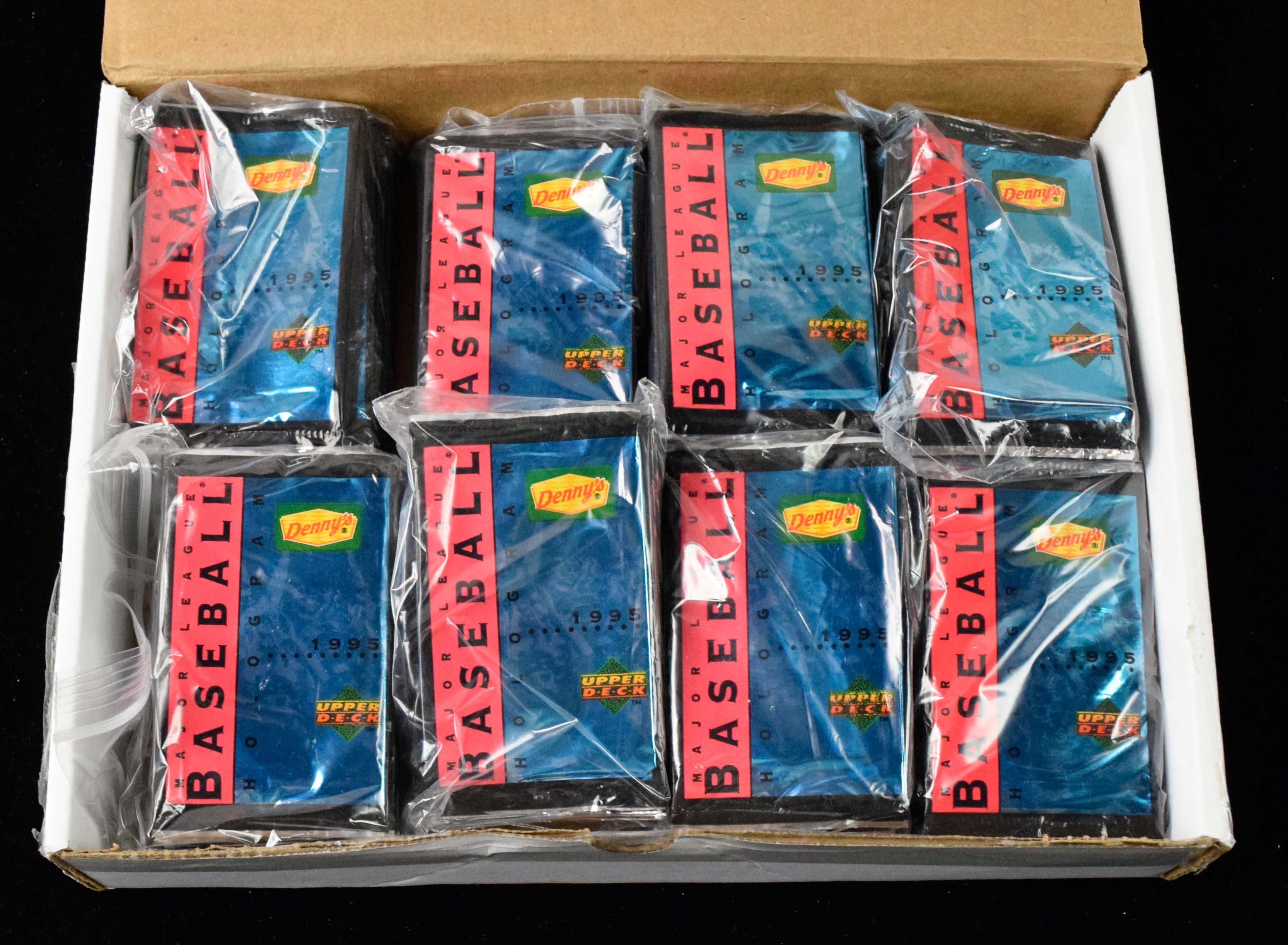 Description:Lot of (200) 1995 Upper Deck "Denny's Holograms" wax packs (NM-NM/MT overall). Each pack contains 1-card. Minimal handling/storage wear, so it is presumed that the cards inside remain in high grade condition: NM-NM/MT overall