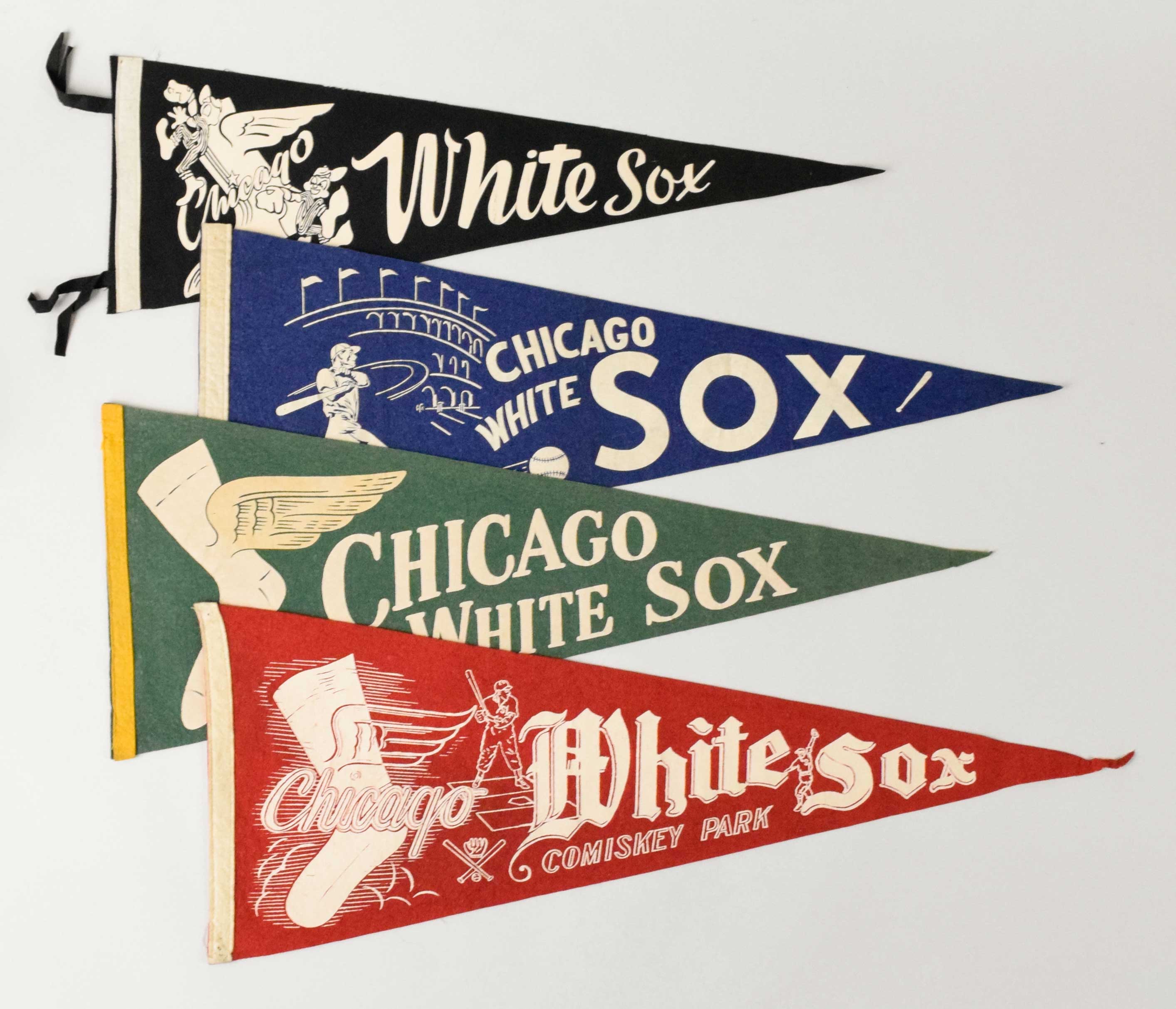 Description:Lot of (4) vintage Chicago White Sox pennants, c.1950s (VG/EX-NM). Includes 25.5" black White Sox pennant with graphic of elves on logo (NM), 28" blue White Sox pennant with batter graphic (EX-EX/MT), 28" green White Sox pennant (VG/EX), and 30" red White Sox pennant (EX).
