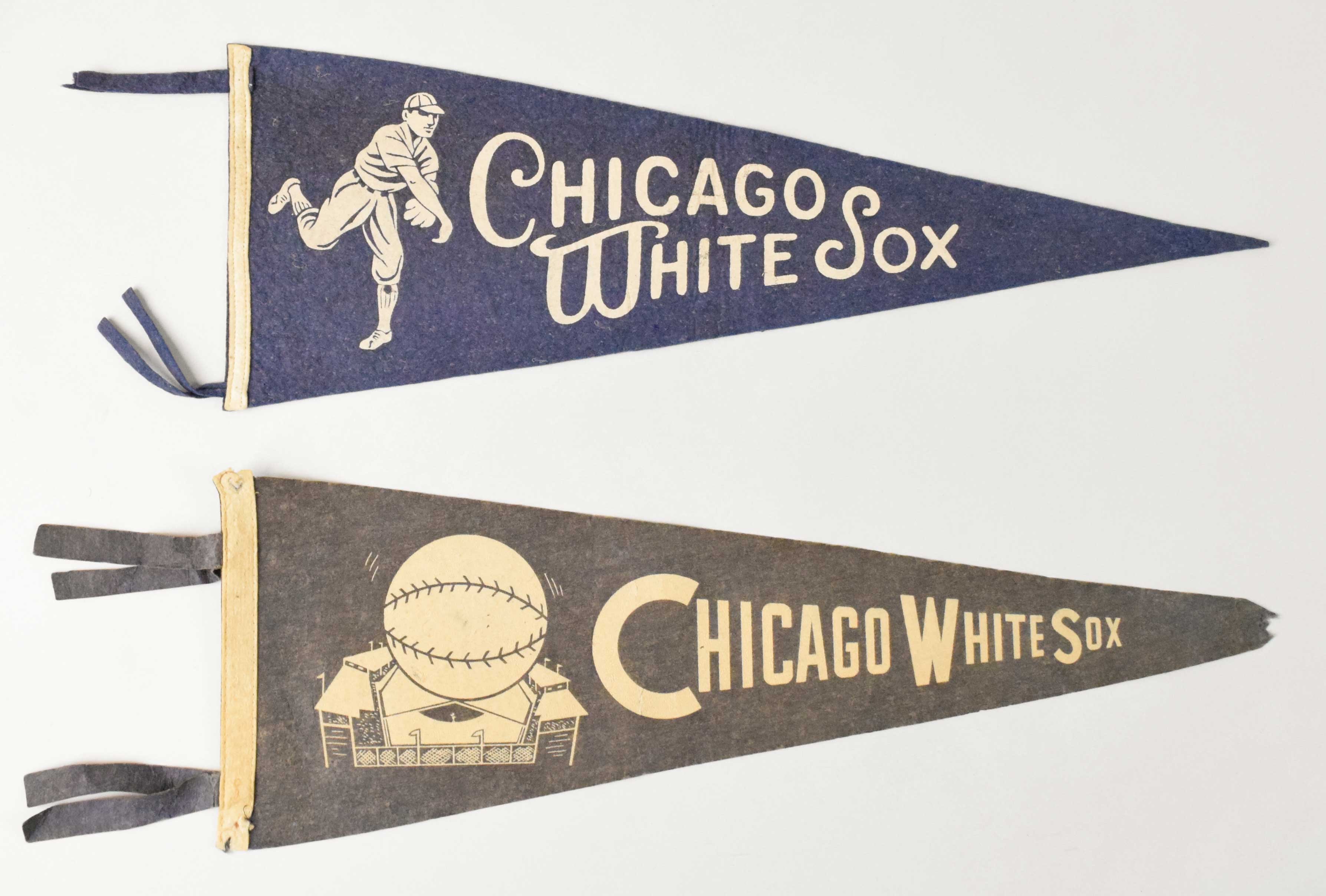 Description:Lot of (2) vintage Chicago White Sox pennants, c.1930s-40s (GD-NM). Includes 24" White Sox pennant with pitcher graphoc (EX/MT-NM), and 24.5" White Sox pennant with Comiskey Park graphic (GD).