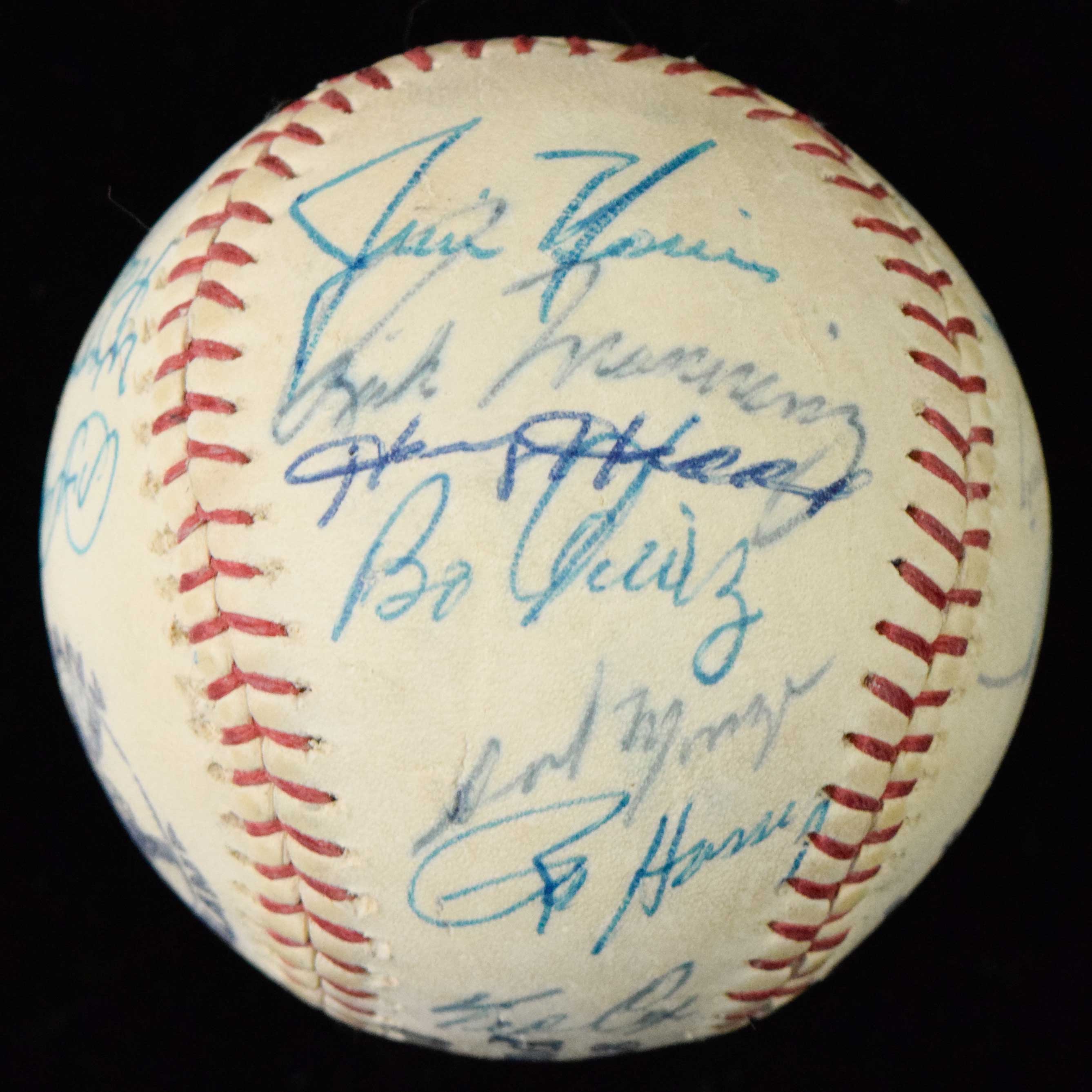 Description:1978 Cleveland Indians team signed baseball - PSA/DNA (EX/MT). Indians logo ball signed by (24) members of the 1978 team including Jeff Torborg, Harvey Haddix, Jim Kern, Mike Paxton, Jim Norris, Duane Kuiper, Sid Monge, David Clyde, Rick Manning, Tom Veryzer, Dave Duncan, Rick Wise, Don Hood, Bo Diaz, and others. Signatures rate 6/7 to 9 (avg 7/8) out of 10. Includes full LOA from PSA/DNA: EX/MT