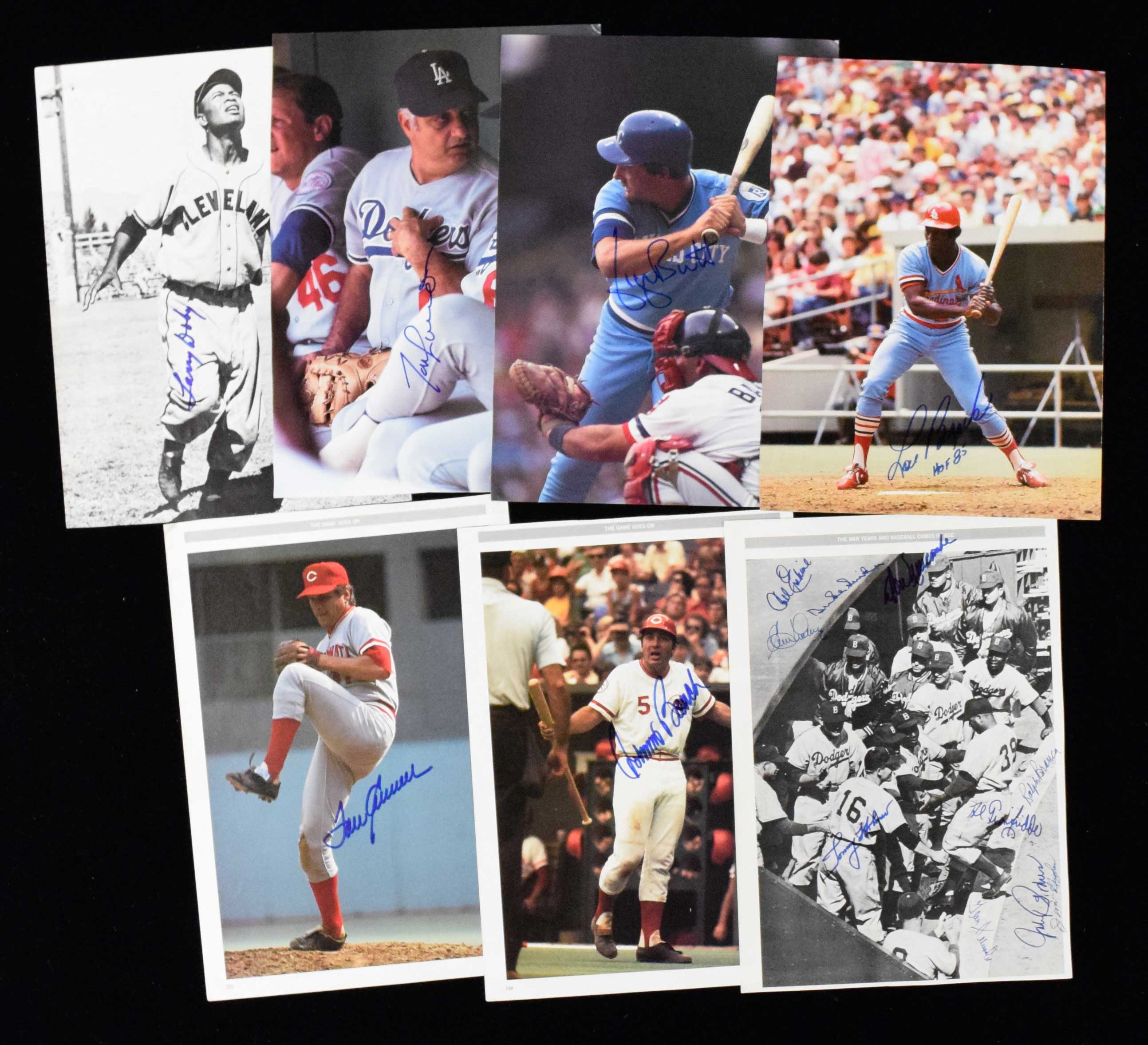 Description:Lot of signed baseball publication page photos - mostly stars & HOFers (EX-NM/MT). Most pages measure approx. 10"x14". Includes single-signed Johnny Bench photo; Single-signed Tom Lasorda photo; Page signed on one side by Tom Seaver and on the other side by Andre Dawson; Page signed on one side by Lou Brock and on the other side by Brooks Robinson; Page signed on one side by George Brett and on the other side by Carlton Fisk; Photo dual-signed by Larry Doby and Johnny Sain (staining on the back); and a photo signed by (10) Brooklyn Dodgers: Duke Snider, Don Newcombe, Carl Erskine, Clem Labine, Ralph Branca, Tommy Holmes, Al Gionfriddo, Johnny Podres, Jim Hughes, and Gene Hermanski. Signatures rate 8 to 10 out of 10: EX-NM/MT